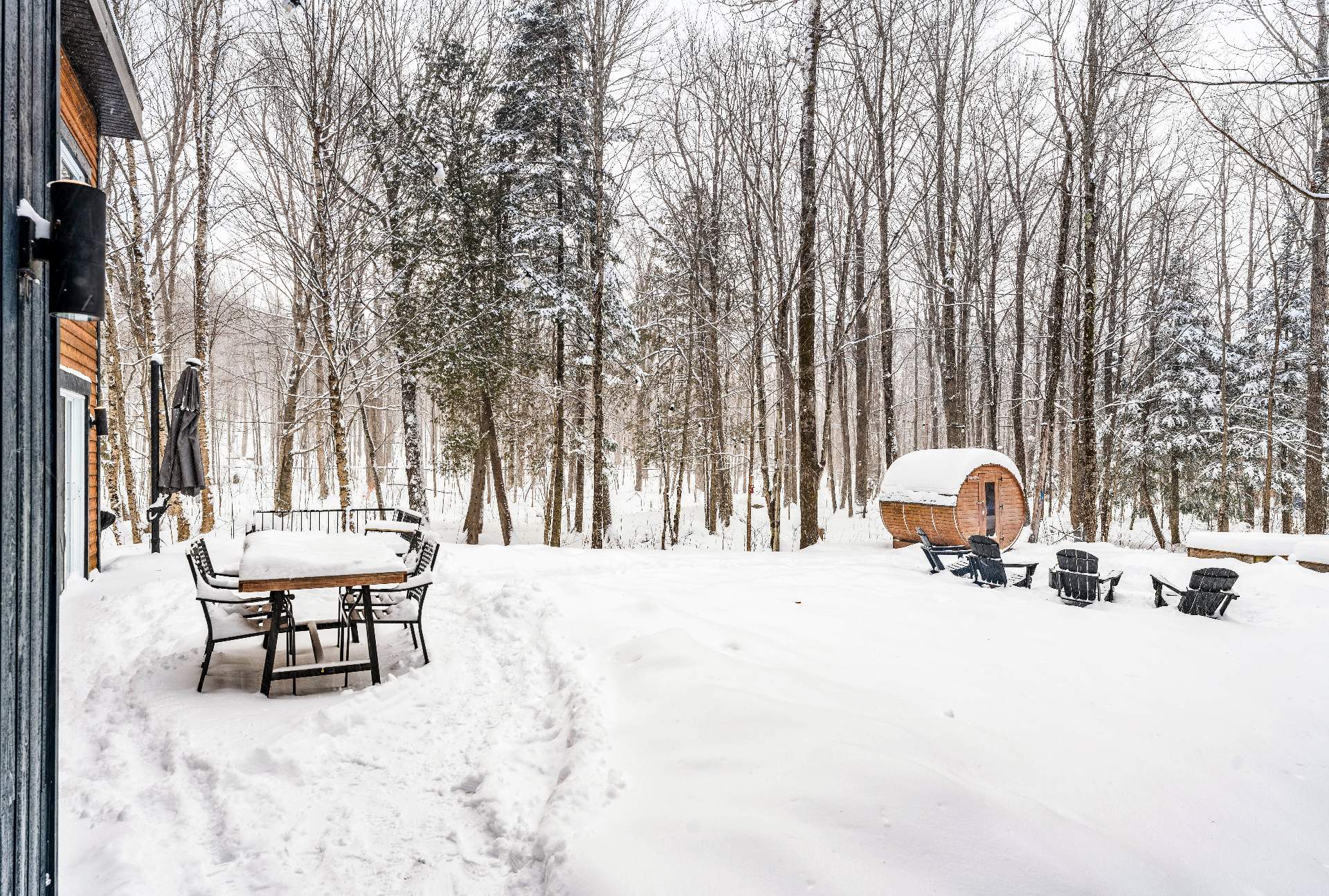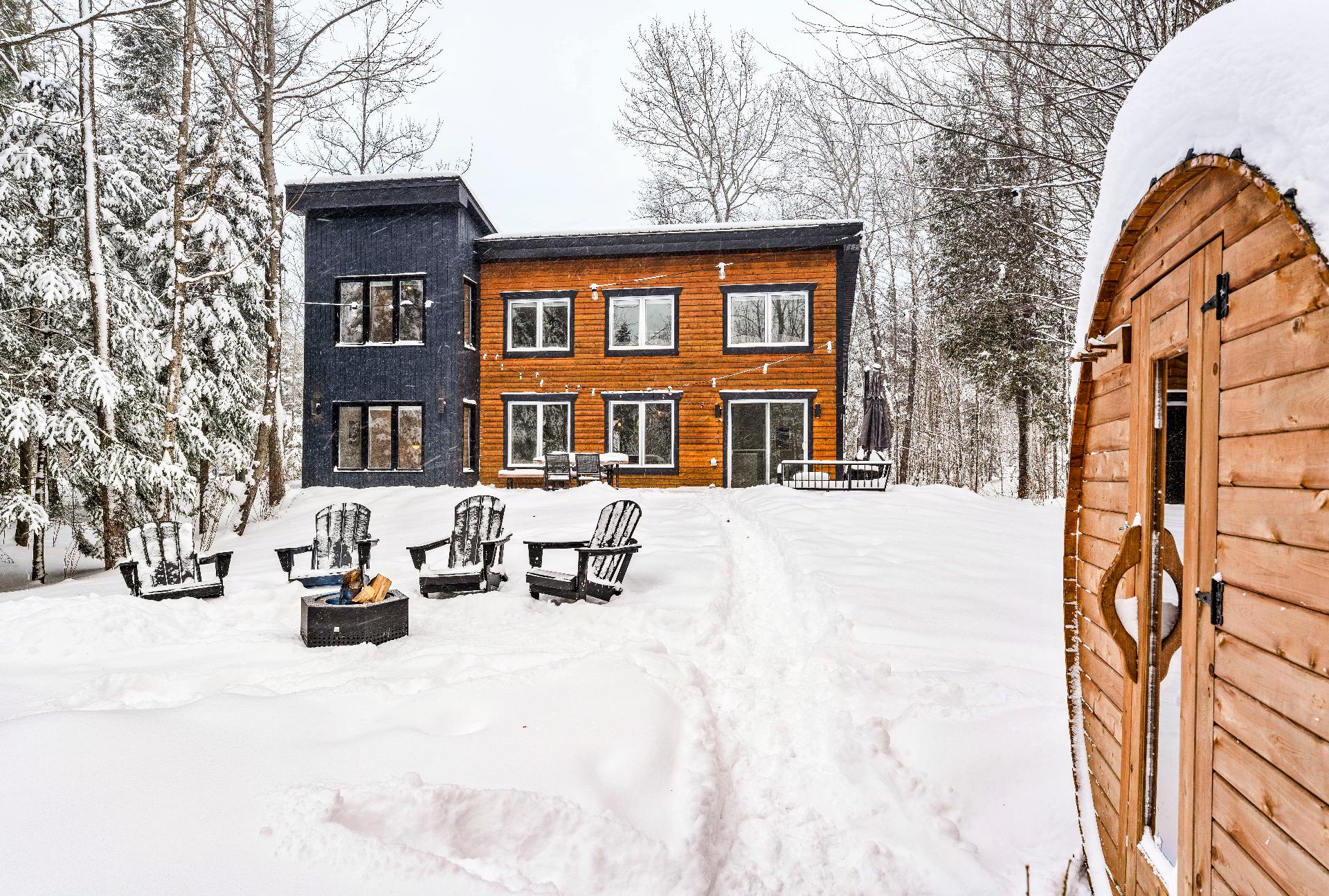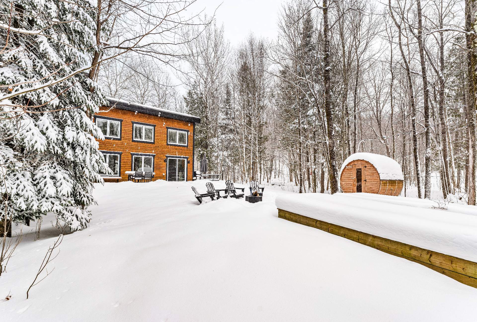 Laissez-vous séduire par ce superbe chalet dans les Cantons de l'Est, niché au coeur de la nature, sur un terrain boisé d'1 acre, offrant quiétude, intimité et bien-être à l'année. Situé à environ 1h15 du Pont Champlain, il représente une proximité idéale pour les gens de la région de Montréal. Dès l'entrée, la fenestration abondante inonde l'espace de lumière naturelle et crée une parfaite harmonie entre l'intérieur et l'extérieur. L'aire de vie ouverte et conviviale met en valeur un foyer au bois, idéal pour les soirées cocooning. La présence généreuse de bois confère à la propriété une ambiance chaleureuse, authentique et apaisante, en parfaite harmonie avec la nature environnante. Le décor, à la fois épuré et chaleureux, s'agence magnifiquement avec le revêtement extérieur, parfaitement intégré au paysage naturel. La cuisine, intemporelle et fonctionnelle, répondra aux besoins des amateurs de design et de praticité. La propriété comprend deux chambres à coucher, dont une avec un immense walk-in, ainsi qu'une mezzanine polyvalente pouvant servir de chambre, de salon ou de bureau. La salle de bain impeccable et le sauna ajoutent une touche de détente et de confort inégalée. À l'extérieur, profitez d'un chemin privé, d'un environnement paisible et d'une tranquillité absolue. La propriété se distingue par un grand abri d'auto polyvalent, comprenant une borne pour voiture électrique, un espace pour le rangement du bois, ainsi qu'un espace de rangement original de type conteneur, offrant de multiples possibilités. Un grand balcon vous permet un accès direct à la nature, avec un espace feu convivial et un emplacement pour cultiver vos fruits et légumes. Le toit en tôle assure durabilité et tranquillité d'esprit. Le chalet offre un excellent potentiel pour la location à court terme. En faisant l'acquisition de cette propriété, vous bénéficierez d'une mention Superhost sur Airbnb, avec une excellente visibilité déjà établie. Situé à proximité du village de Eastman, le chalet offre un accès facile aux commodités : épicerie, cafés, restaurants, et toutes les commodités quotidiennes. Pour les amateurs de plein air, la piste cyclable de la Route Verte se situe à seulement 500 mètres, et la région environnante possède plusieurs lacs accessibles pour les activités nautiques. De plus, plusieurs montagnes de ski alpin se trouvent à proximité, dont le Mont Orford, Bromont, Sutton, Owls Head et Jay Peak, offrant un éventail d'activités hivernales. Le tout est également à proximité du parc national du Mont-Orford, pour des activités de plein air variées à l'année. Ce chalet est un véritable havre de paix où la santé et le bien-être sont enveloppés par la nature, tout en restant proche des attraits du village et de la région. Que ce soit pour une résidence principale, secondaire ou même pour la location à court terme, ce chaleureux chalet a tout pour plaire. La présente vente est faite sans garantie légale au risque et périls de l'acheteur.