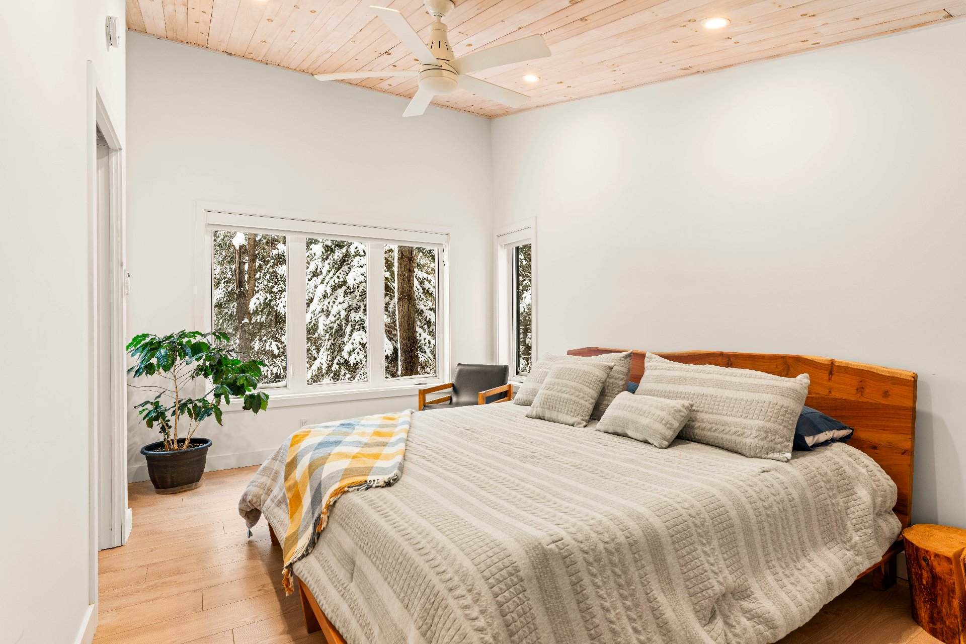 Base du lit king, matelas lit king, cadres, plantes, meuble de télévision en bois, télévision, pouf jaune, vaisselle.
