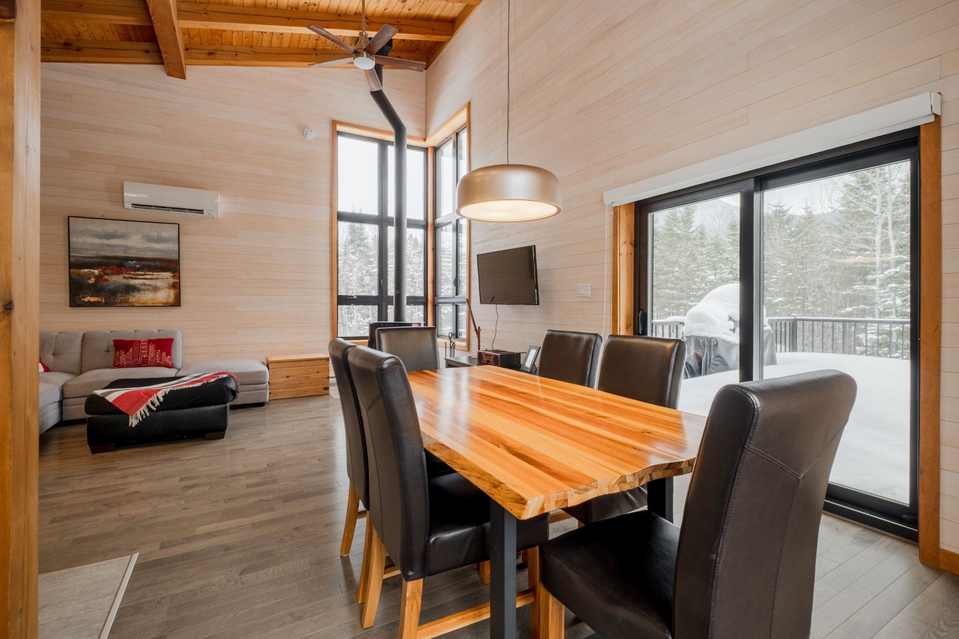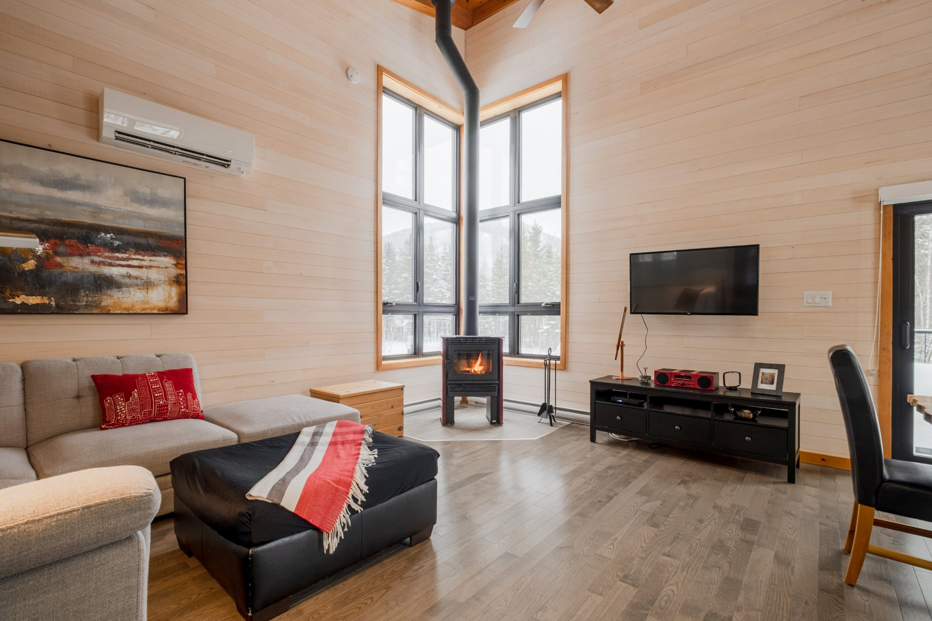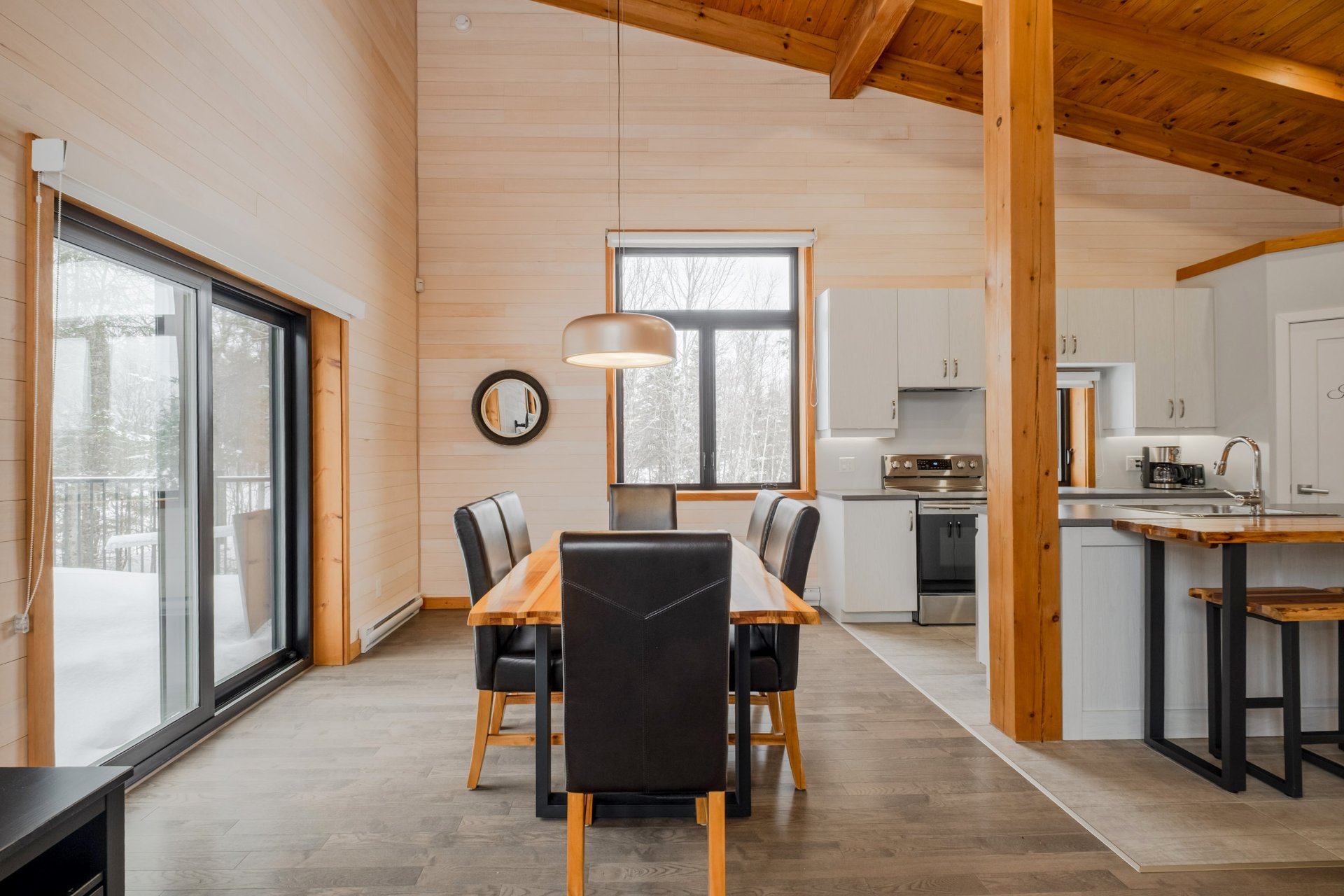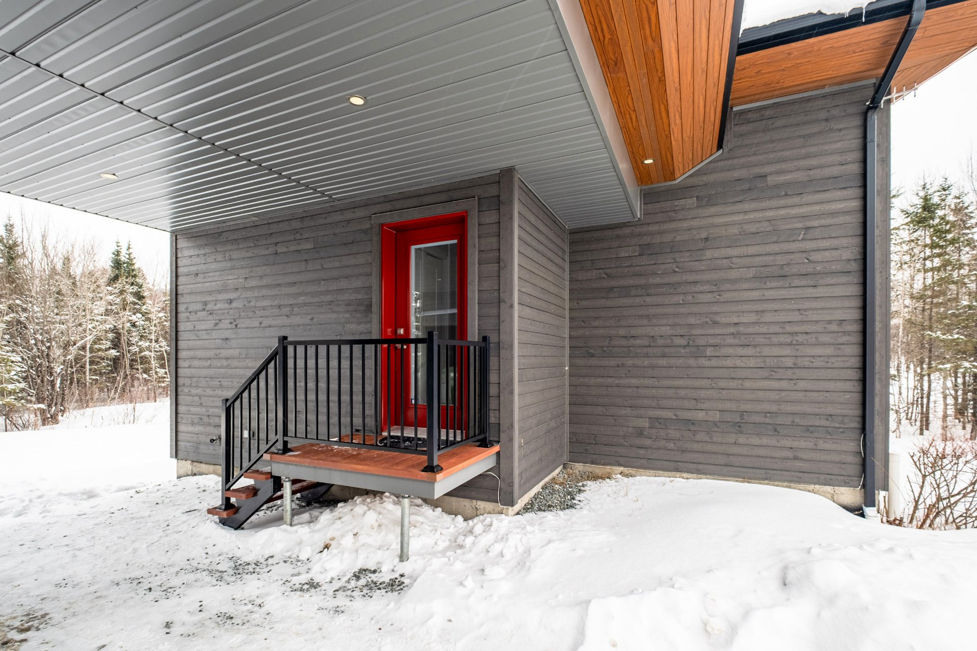 Découvrez une propriété au design soigné, parfaitement intégrée à son environnement naturel. Située au sein du projet immobilier écologique « Au pied du mont Ham », cette résidence vous accueille dans un cadre intime et boisé, où le calme et la nature s'imposent dès les premiers instants. Vous bénéficierez d'un milieu de vie unique, porté par une communauté engagée qui valorise un mode de vie en pleine nature et contribue activement au projet, notamment par sa participation à des initiatives collectives, dont le jardin communautaire. L'entrée principale s'ouvre sur un espace de vie lumineux à aire ouverte, marqué par des plafonds cathédrales et de chaleureuses boiseries qui rappellent une esthétique scandinave contemporaine. Le salon, agrémenté d'un foyer, devient un lieu rassembleur, idéal pour se détendre tout en profitant d'une vue directe et saisissante sur le mont Ham. La cuisine, fonctionnelle et entièrement au goût du jour, s'intègre harmonieusement à la salle à manger, créant un espace fluide et convivial, parfait autant pour le quotidien que pour recevoir. Une salle de bain complète se trouve également au rez-de-chaussée. Le niveau inférieur accueille les chambres ainsi qu'un espace bureau, offrant une grande polyvalence selon vos besoins. L'accès extérieur à ce niveau ajoute une dimension pratique et appréciable, que ce soit pour la vie familiale, le télétravail ou l'accueil d'invités. Une seconde salle de bain complète vient parfaire l'aménagement intérieur. À l'extérieur, le terrain boisé procure une intimité remarquable et une vue imprenable sur le mont Ham, en toute saison. Le balcon vous invite à profiter pleinement de l'environnement naturel, tandis que le grand stationnement facilite l'accueil de plusieurs véhicules. Un abri couvre l'entrée de voiture et un espace est prévu pour le rangement du bois de chauffage. La propriété se situe à environ 500 mètres de l'entrée du Parc régional du Mont-Ham, accessible à pied, et s'inscrit dans un éco-quartier reconnu pour sa qualité de vie et son approche durable. Ce secteur est prisé pour ses sentiers pédestres, de ski de fond et de raquette, ainsi que pour son accès privilégié à la nature. La résidence se prête parfaitement à la location à court terme dans cette région touristique recherchée, offrant ainsi une flexibilité d'usage des plus intéressantes. Cette propriété représente une occasion rare de vivre ou d'investir dans un milieu où le confort moderne rencontre un environnement naturel d'exception. La présente vente est faite sans garantie légale de qualité, aux risques et périls de l'acheteur.