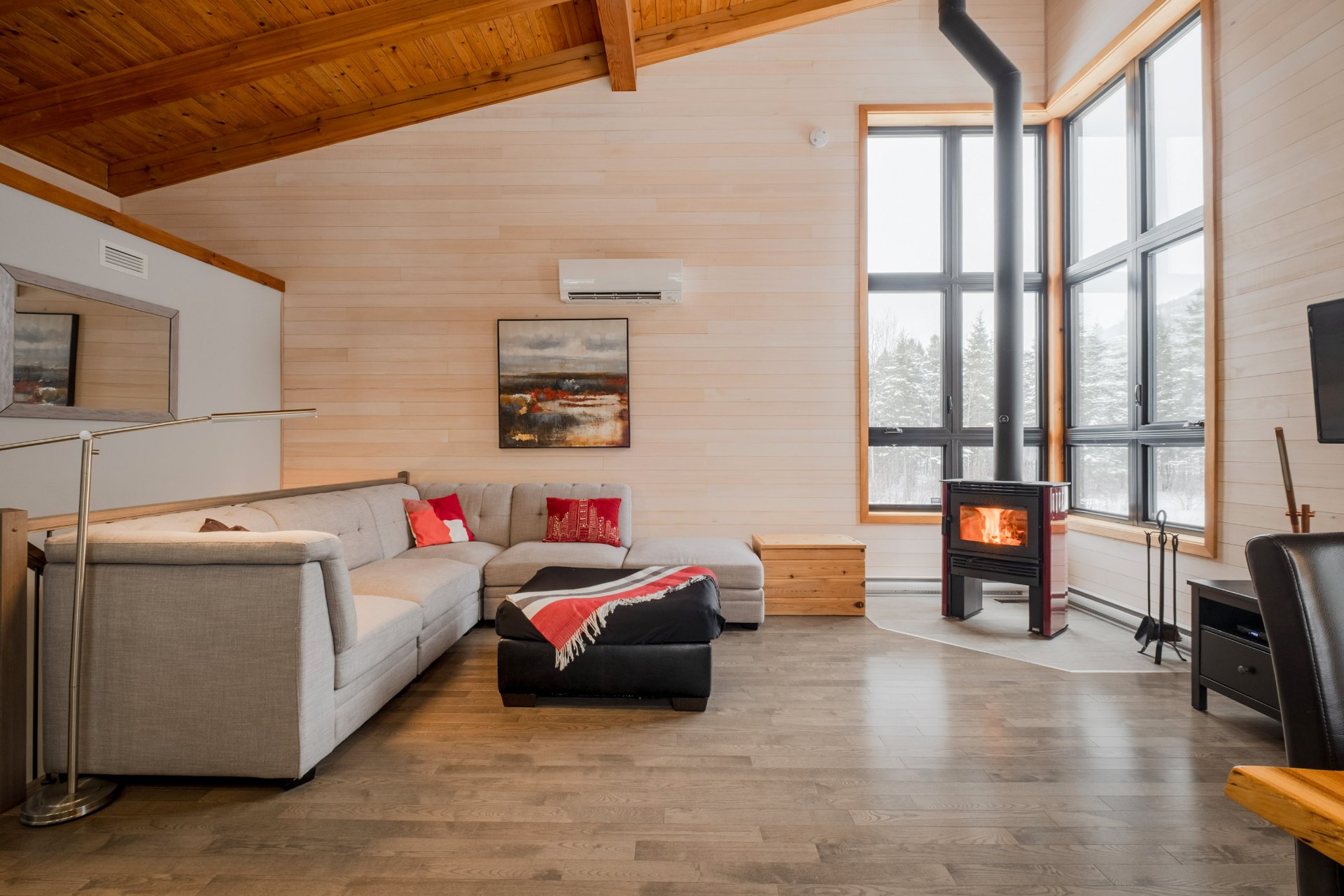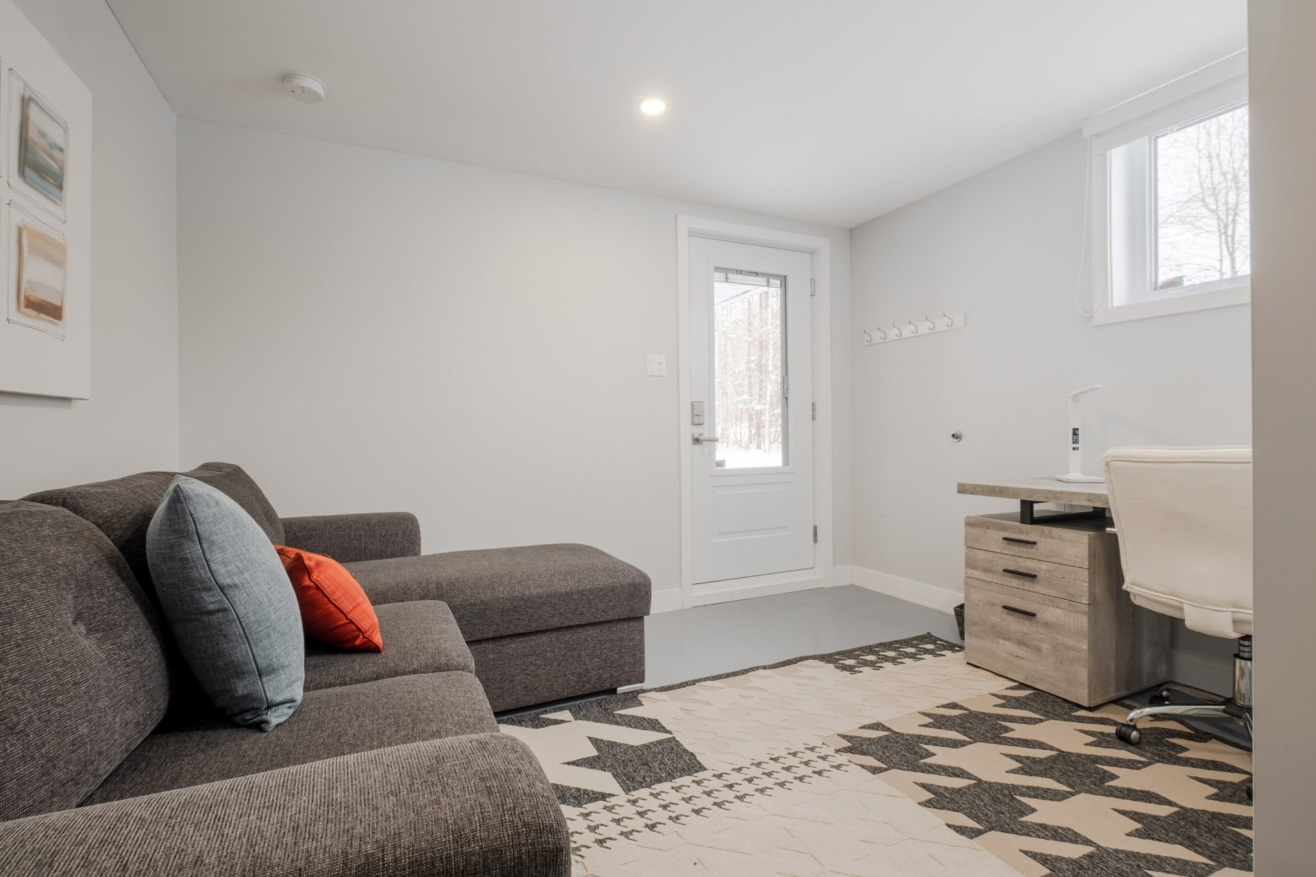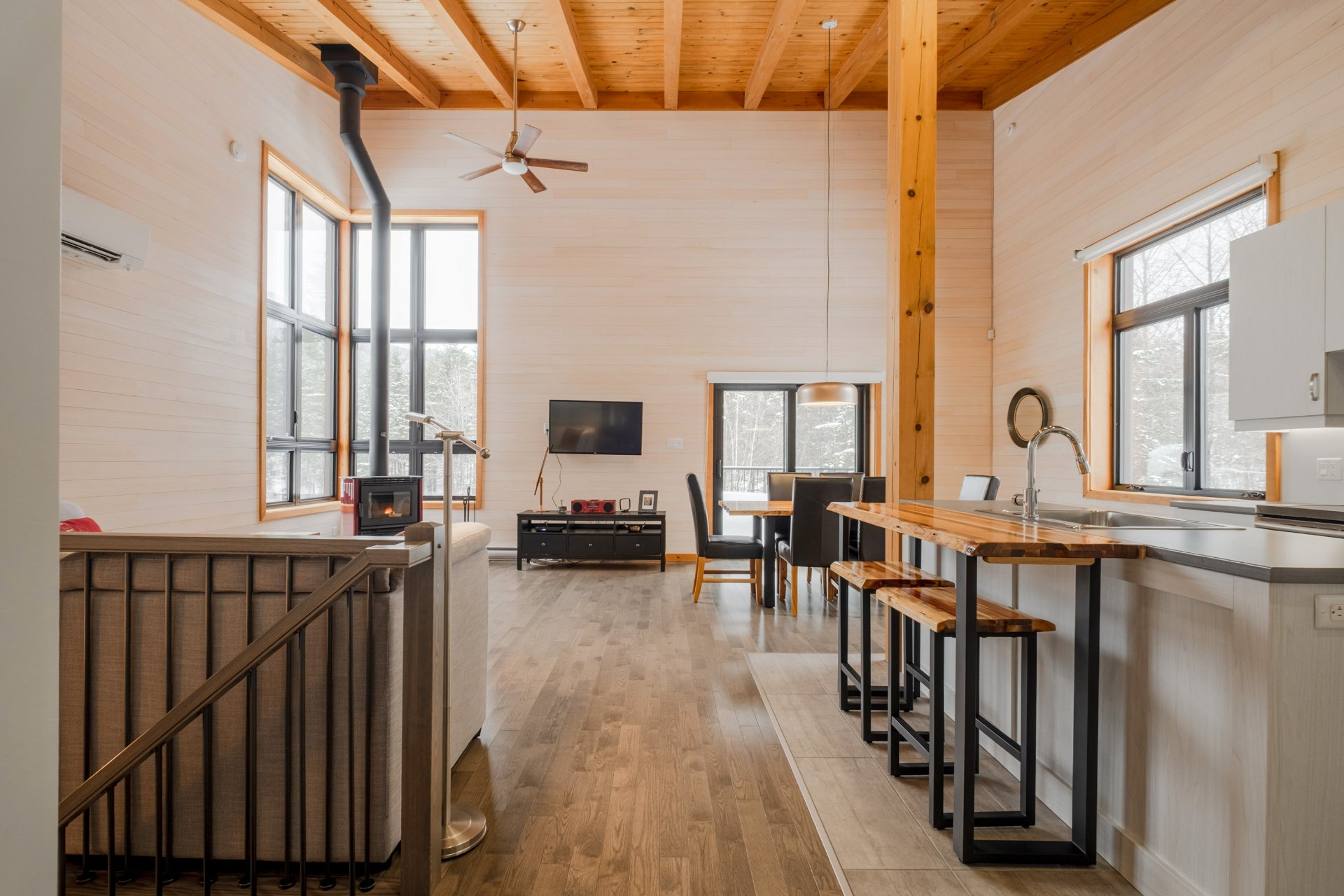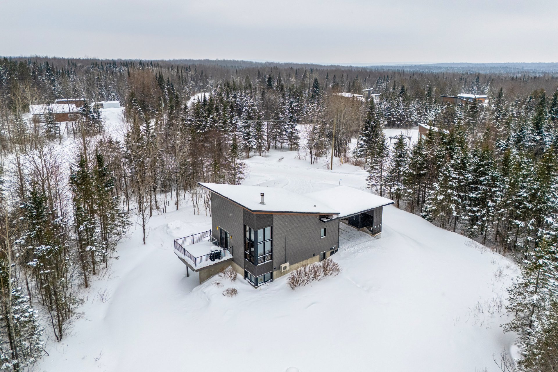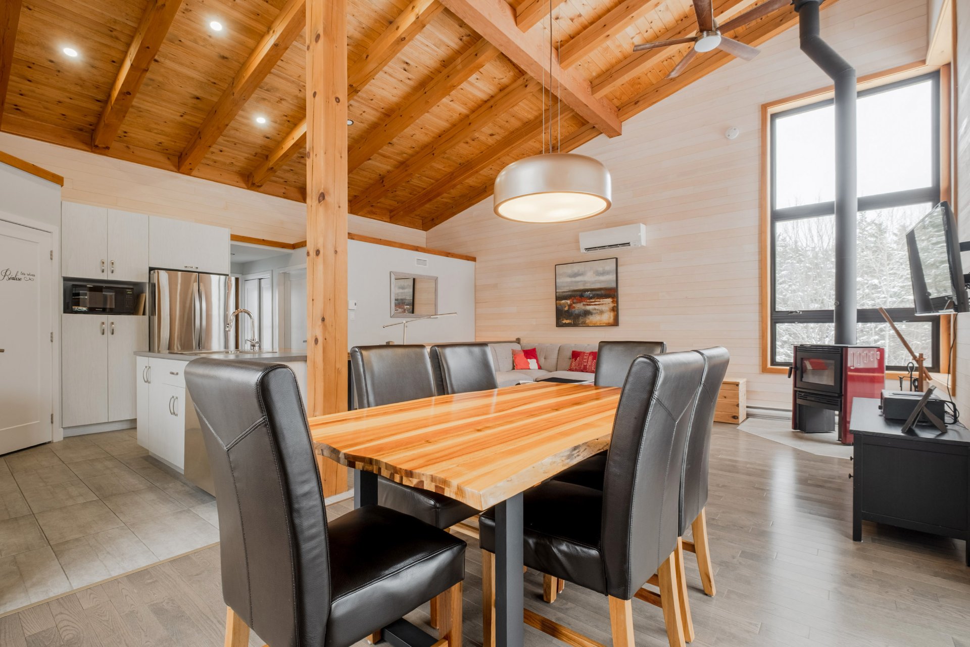 Découvrez une propriété au design soigné, parfaitement intégrée à son environnement naturel. Située au sein du projet immobilier écologique « Au pied du mont Ham », cette résidence vous accueille dans un cadre intime et boisé, où le calme et la nature s'imposent dès les premiers instants. Vous bénéficierez d'un milieu de vie unique, porté par une communauté engagée qui valorise un mode de vie en pleine nature et contribue activement au projet, notamment par sa participation à des initiatives collectives, dont le jardin communautaire. L'entrée principale s'ouvre sur un espace de vie lumineux à aire ouverte, marqué par des plafonds cathédrales et de chaleureuses boiseries qui rappellent une esthétique scandinave contemporaine. Le salon, agrémenté d'un foyer, devient un lieu rassembleur, idéal pour se détendre tout en profitant d'une vue directe et saisissante sur le mont Ham. La cuisine, fonctionnelle et entièrement au goût du jour, s'intègre harmonieusement à la salle à manger, créant un espace fluide et convivial, parfait autant pour le quotidien que pour recevoir. Une salle de bain complète se trouve également au rez-de-chaussée. Le niveau inférieur accueille les chambres ainsi qu'un espace bureau, offrant une grande polyvalence selon vos besoins. L'accès extérieur à ce niveau ajoute une dimension pratique et appréciable, que ce soit pour la vie familiale, le télétravail ou l'accueil d'invités. Une seconde salle de bain complète vient parfaire l'aménagement intérieur. À l'extérieur, le terrain boisé procure une intimité remarquable et une vue imprenable sur le mont Ham, en toute saison. Le balcon vous invite à profiter pleinement de l'environnement naturel, tandis que le grand stationnement facilite l'accueil de plusieurs véhicules. Un abri couvre l'entrée de voiture et un espace est prévu pour le rangement du bois de chauffage. La propriété se situe à environ 500 mètres de l'entrée du Parc régional du Mont-Ham, accessible à pied, et s'inscrit dans un éco-quartier reconnu pour sa qualité de vie et son approche durable. Ce secteur est prisé pour ses sentiers pédestres, de ski de fond et de raquette, ainsi que pour son accès privilégié à la nature. La résidence se prête parfaitement à la location à court terme dans cette région touristique recherchée, offrant ainsi une flexibilité d'usage des plus intéressantes. Cette propriété représente une occasion rare de vivre ou d'investir dans un milieu où le confort moderne rencontre un environnement naturel d'exception. La présente vente est faite sans garantie légale de qualité, aux risques et périls de l'acheteur.