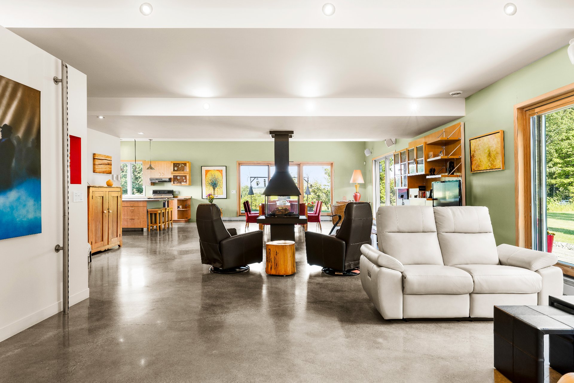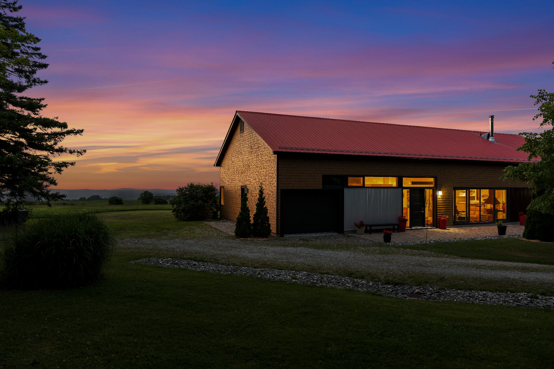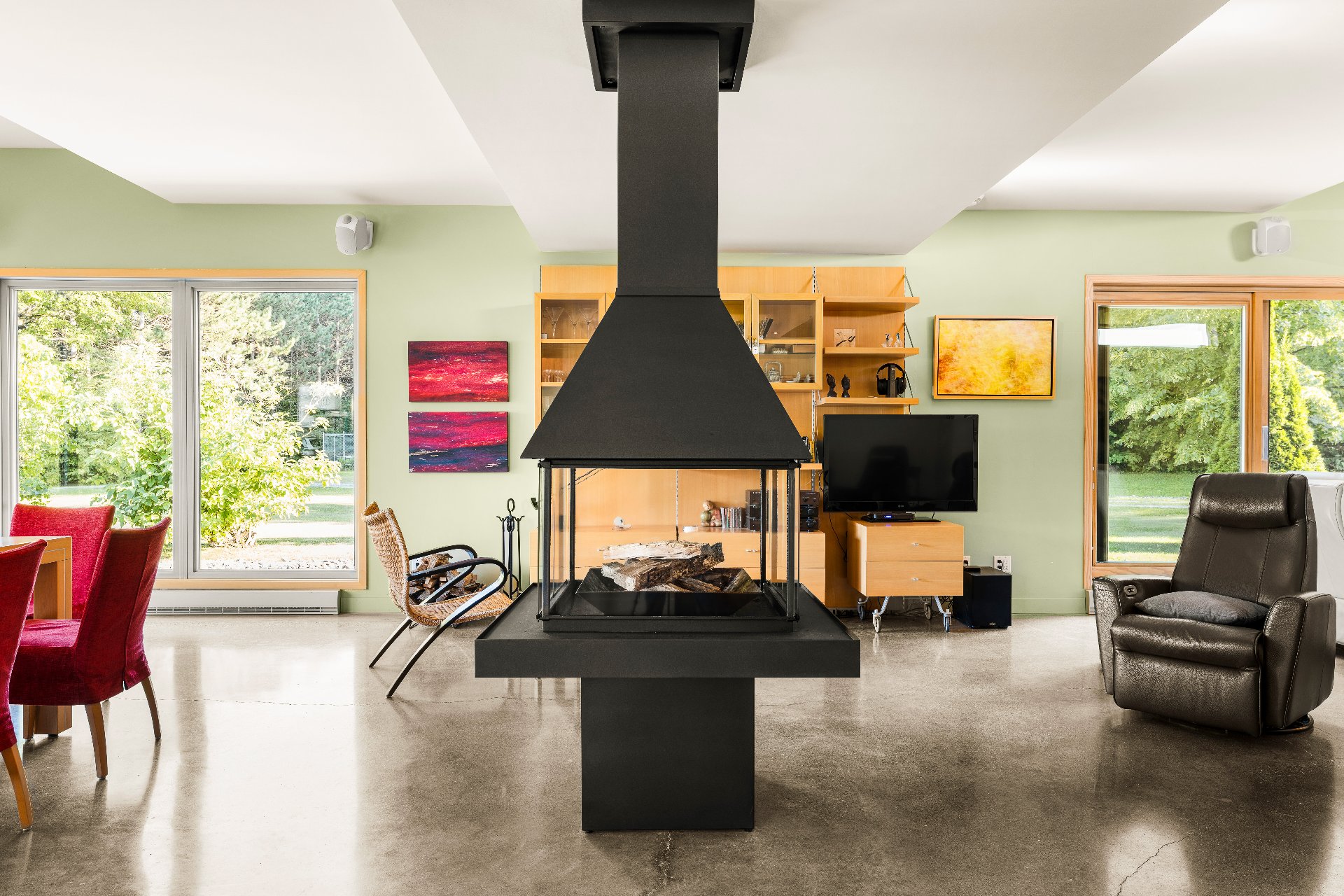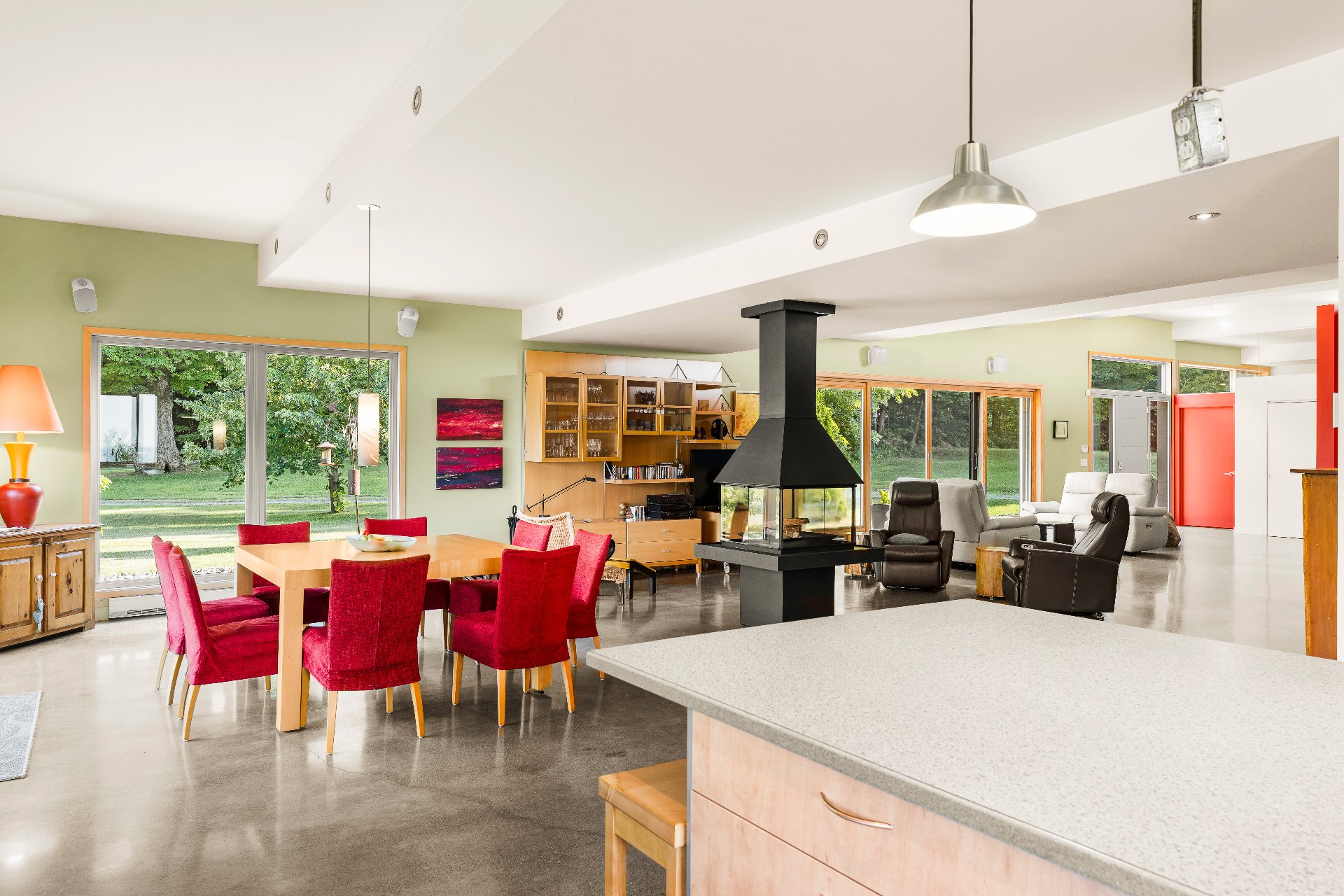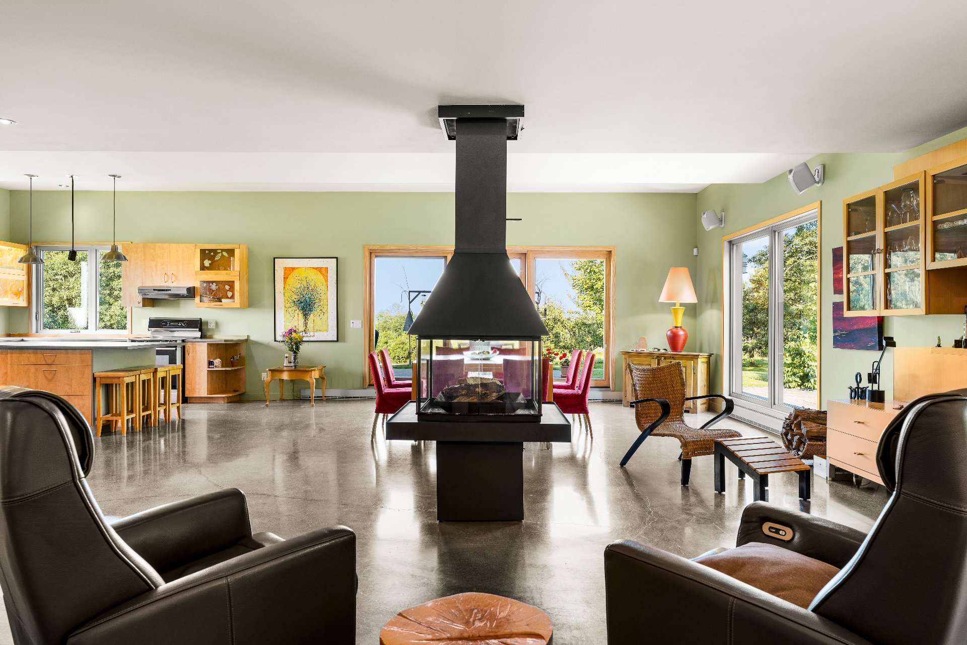 L'intérieur est à la hauteur : fenestration abondante, lumière naturelle omniprésente, foyer central à 4 faces, cuisine avec cellier (350 bouteilles) en érable massif pouvant servir de garde-manger, 3 ch. dont une suite des maîtres avec penderie w.-in, s. d'eau et accès à une s. de bain avec bain et douche en verre. La résidence comprend également une s. technique et un garage simple avec mezzanine de rangement.