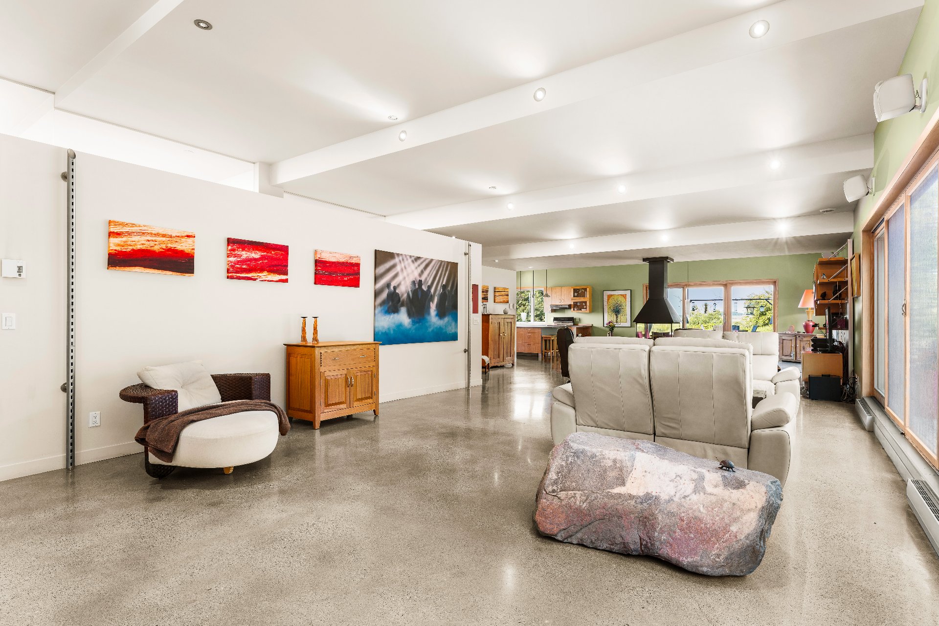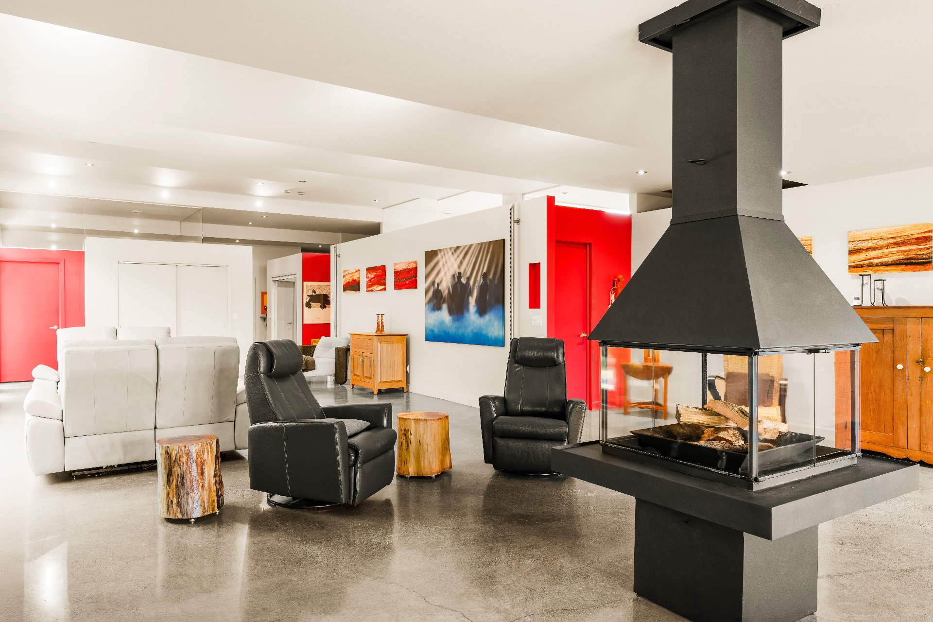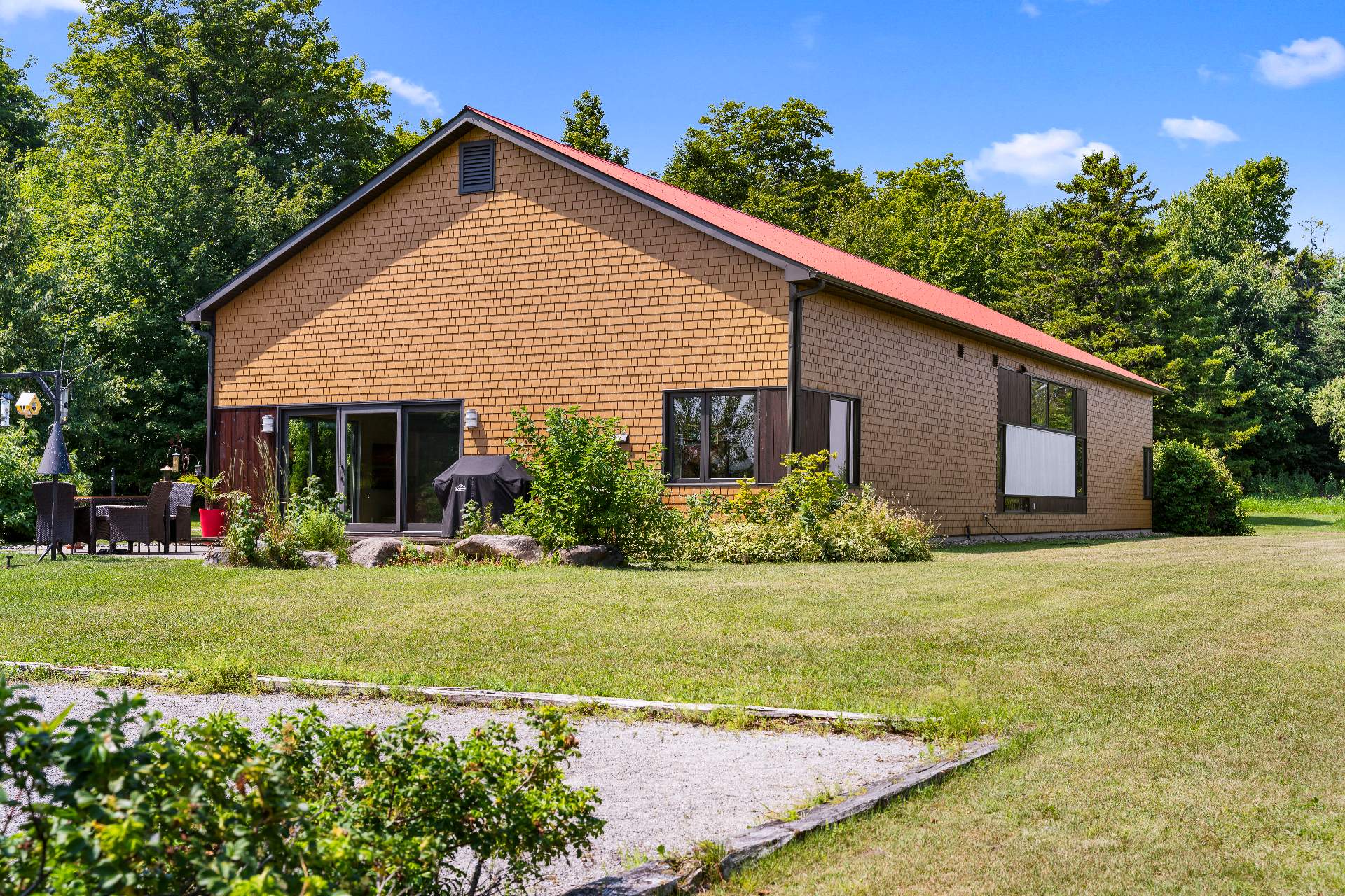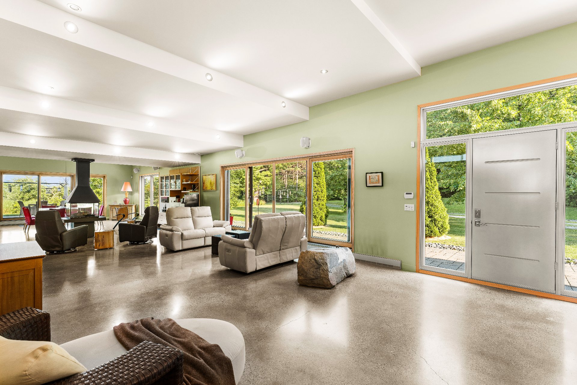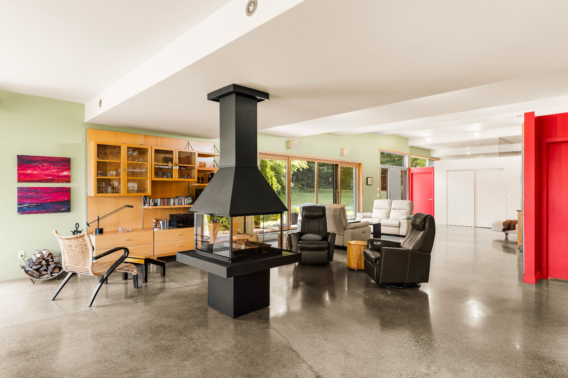 L'intérieur est à la hauteur : fenestration abondante, lumière naturelle omniprésente, foyer central à 4 faces, cuisine avec cellier (350 bouteilles) en érable massif pouvant servir de garde-manger, 3 ch. dont une suite des maîtres avec penderie w.-in, s. d'eau et accès à une s. de bain avec bain et douche en verre. La résidence comprend également une s. technique et un garage simple avec mezzanine de rangement.
