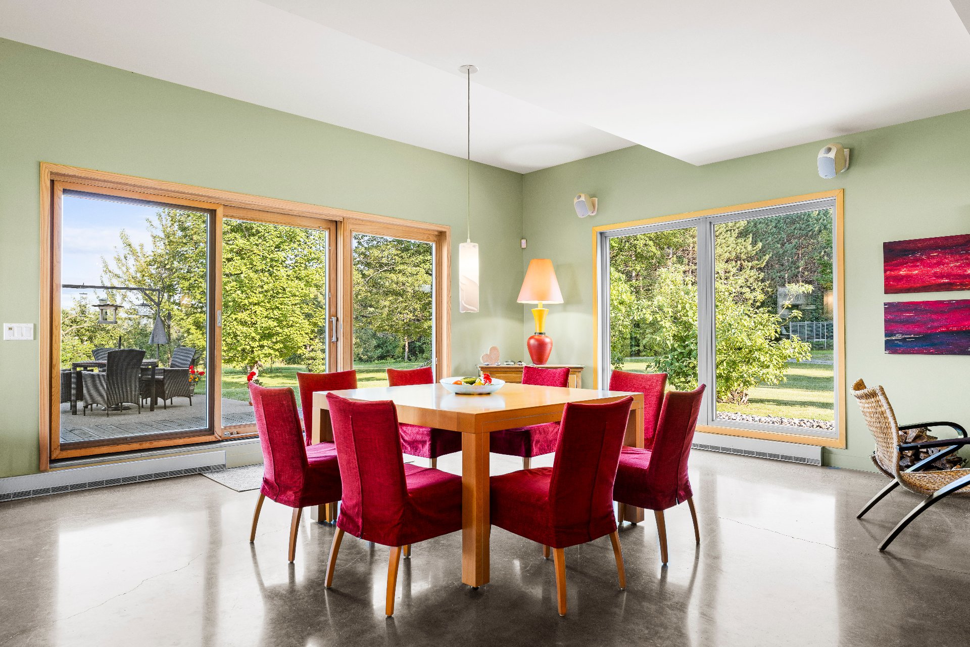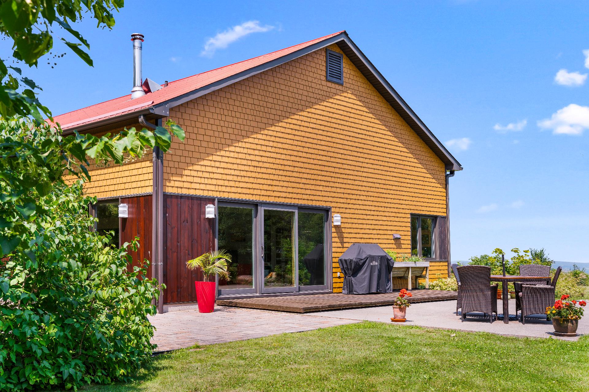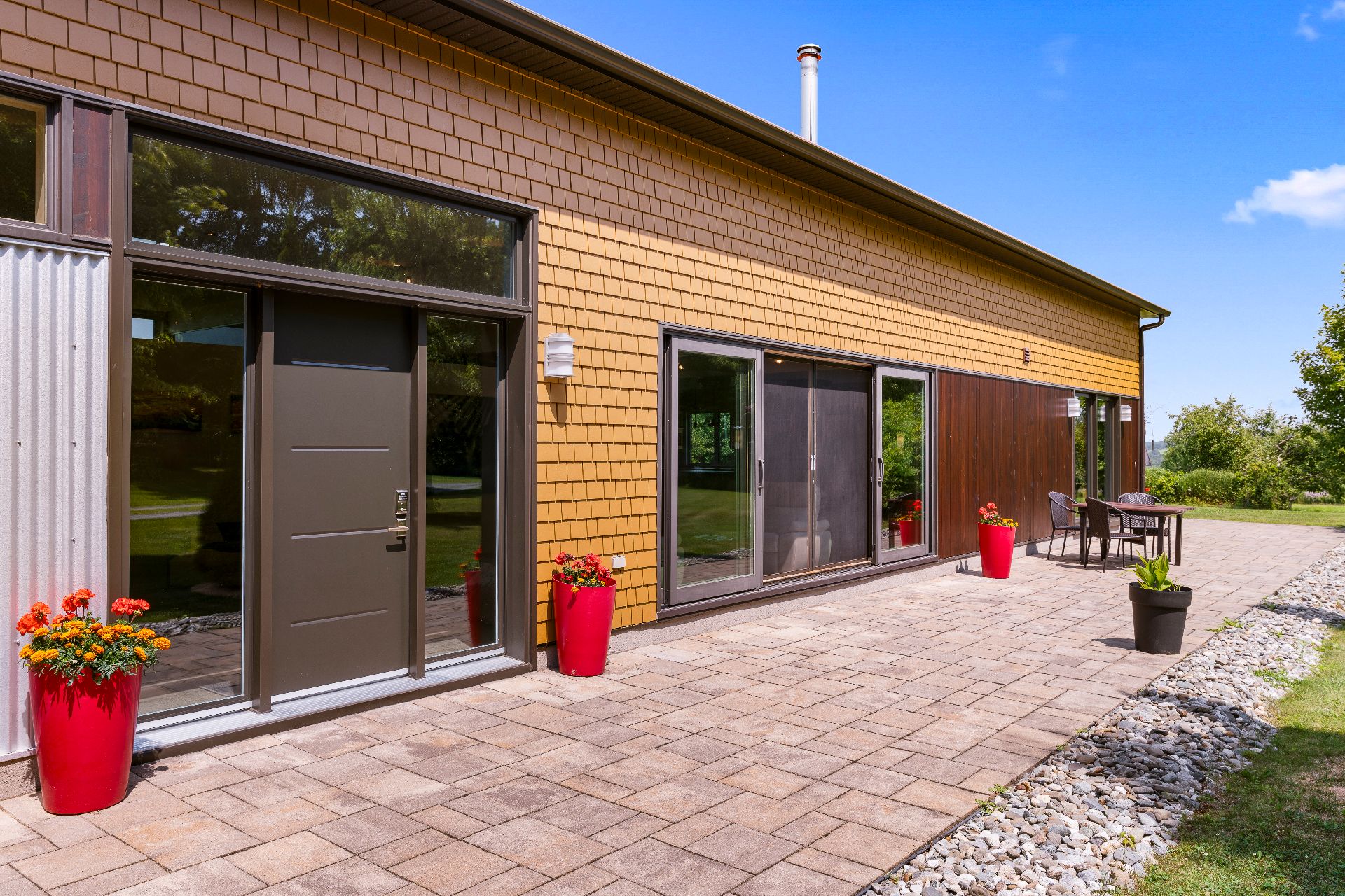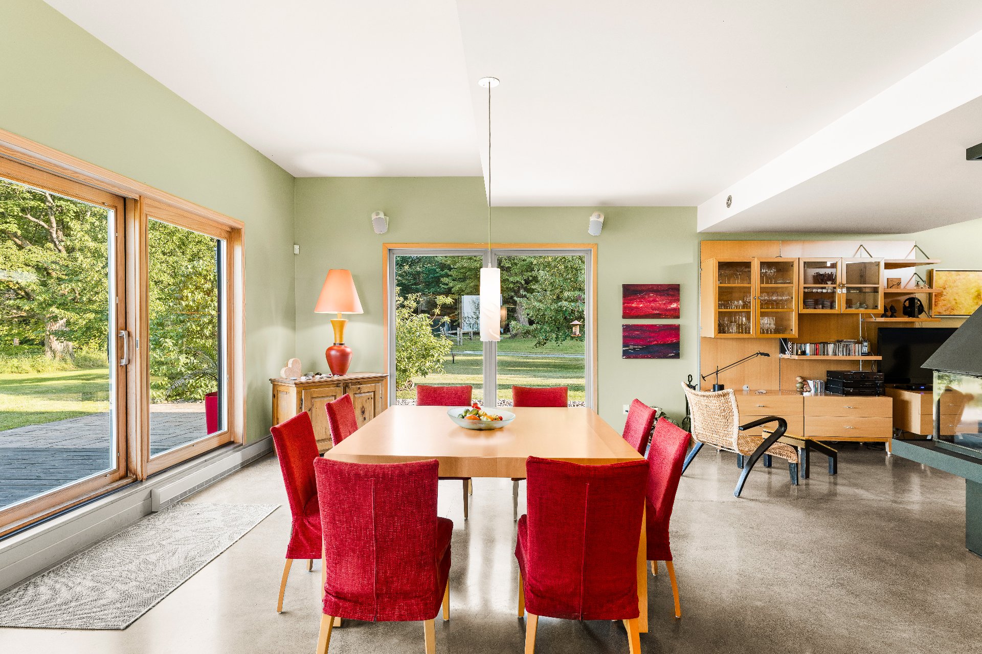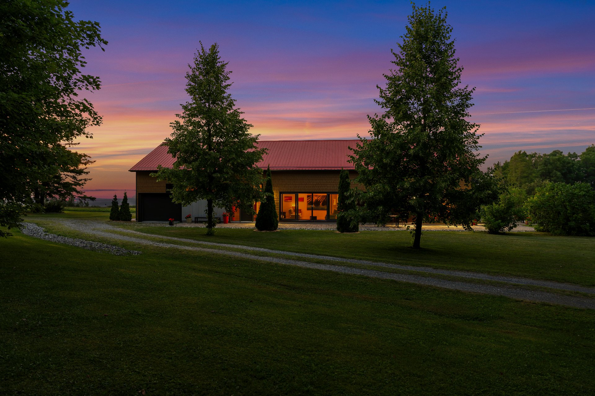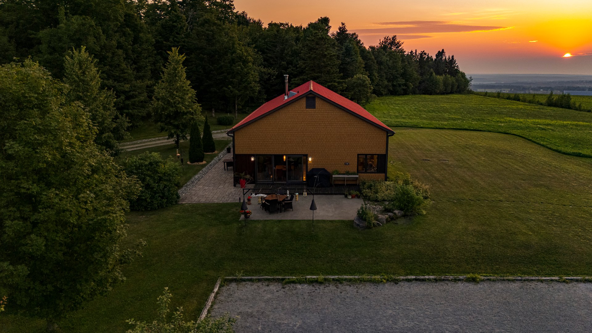 L'intérieur est à la hauteur : fenestration abondante, lumière naturelle omniprésente, foyer central à 4 faces, cuisine avec cellier (350 bouteilles) en érable massif pouvant servir de garde-manger, 3 ch. dont une suite des maîtres avec penderie w.-in, s. d'eau et accès à une s. de bain avec bain et douche en verre. La résidence comprend également une s. technique et un garage simple avec mezzanine de rangement.