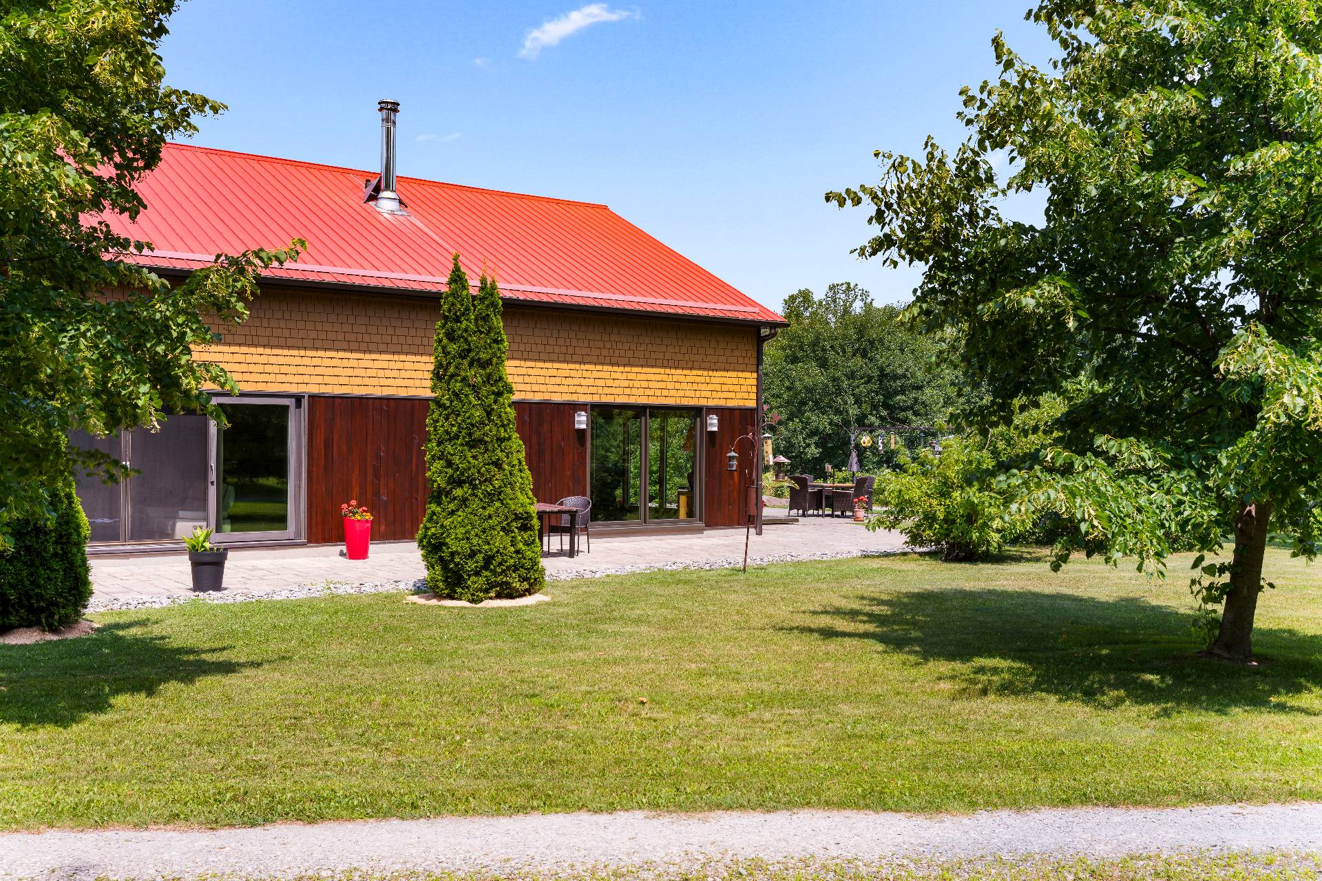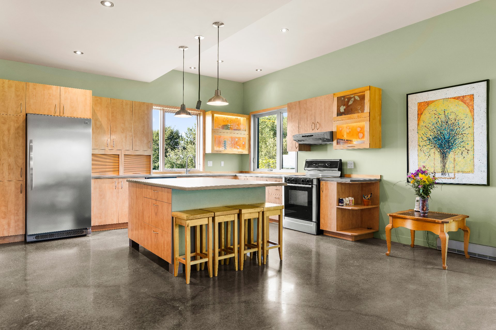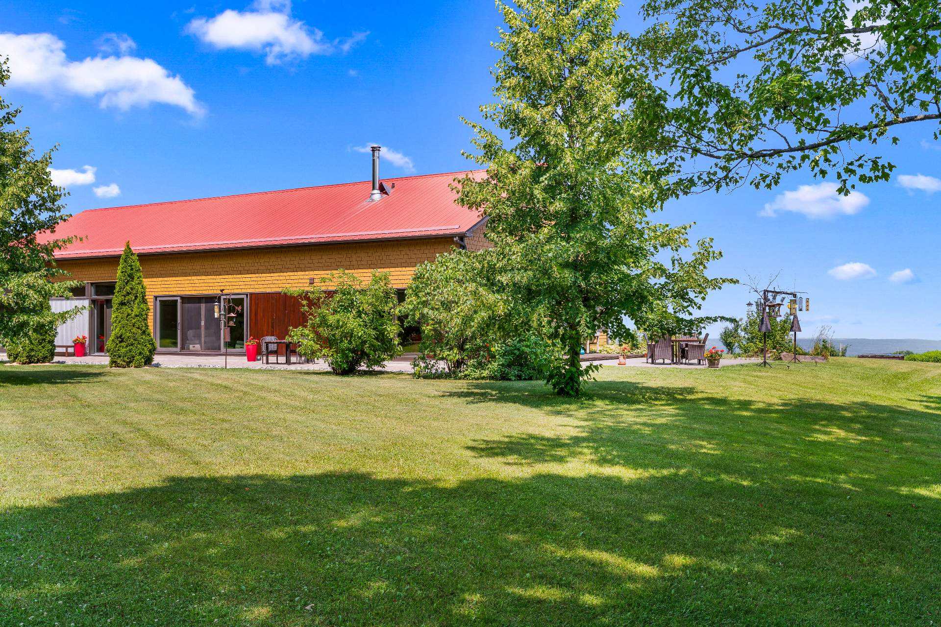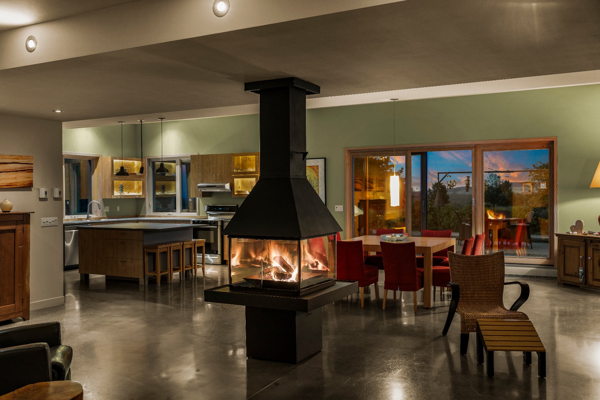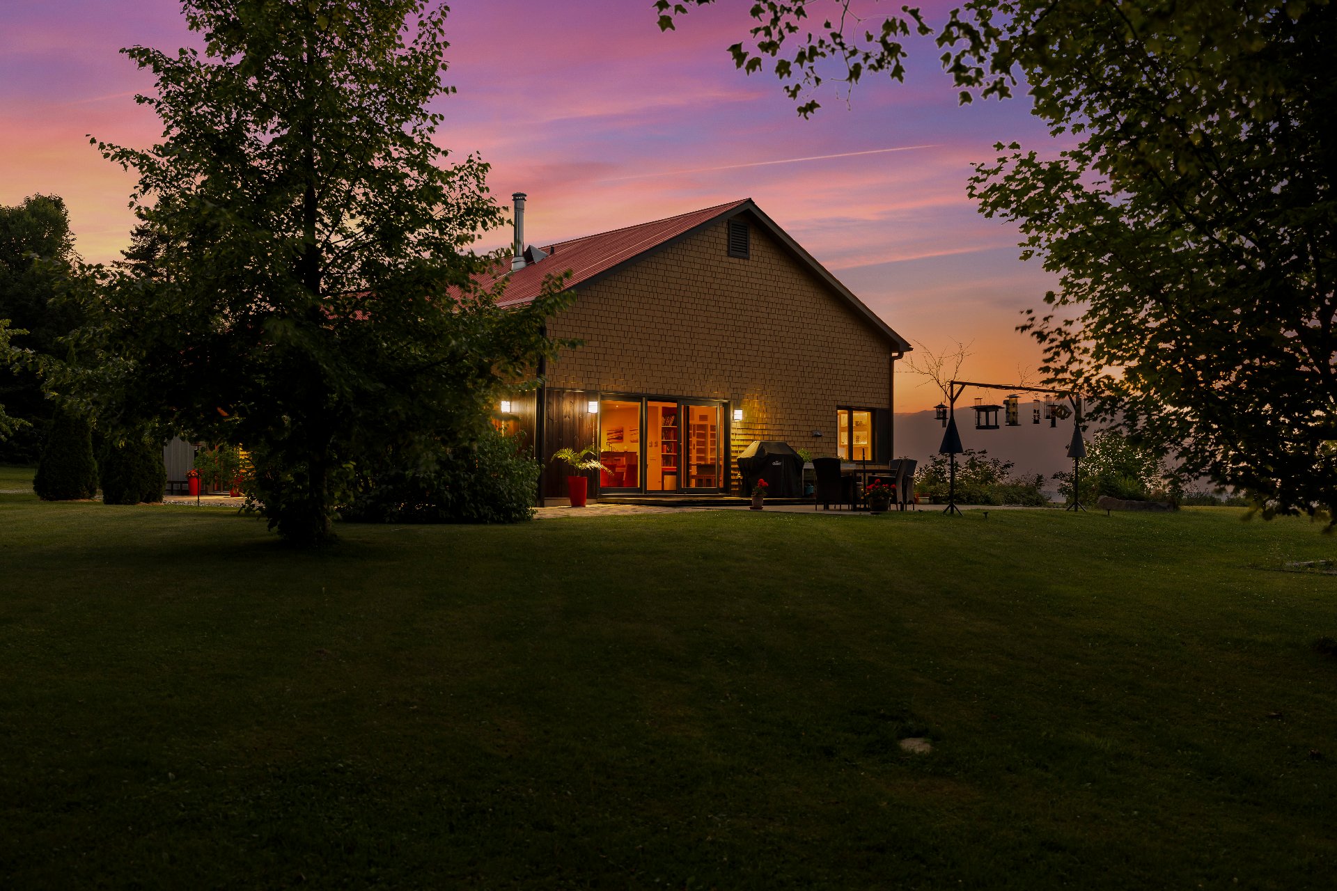 L'intérieur est à la hauteur : fenestration abondante, lumière naturelle omniprésente, foyer central à 4 faces, cuisine avec cellier (350 bouteilles) en érable massif pouvant servir de garde-manger, 3 ch. dont une suite des maîtres avec penderie w.-in, s. d'eau et accès à une s. de bain avec bain et douche en verre. La résidence comprend également une s. technique et un garage simple avec mezzanine de rangement.