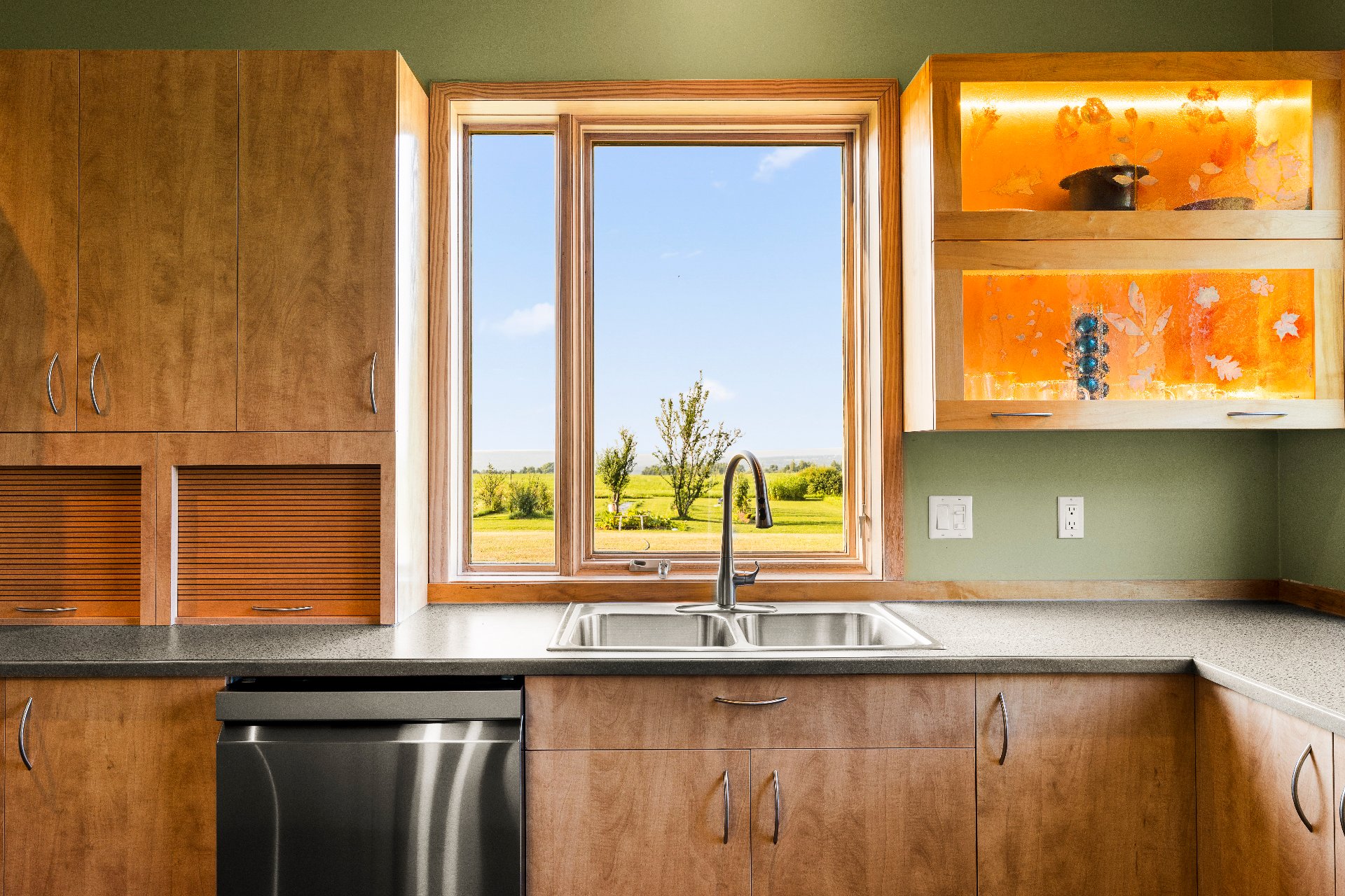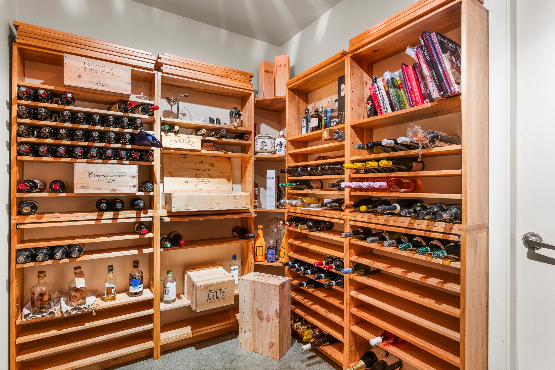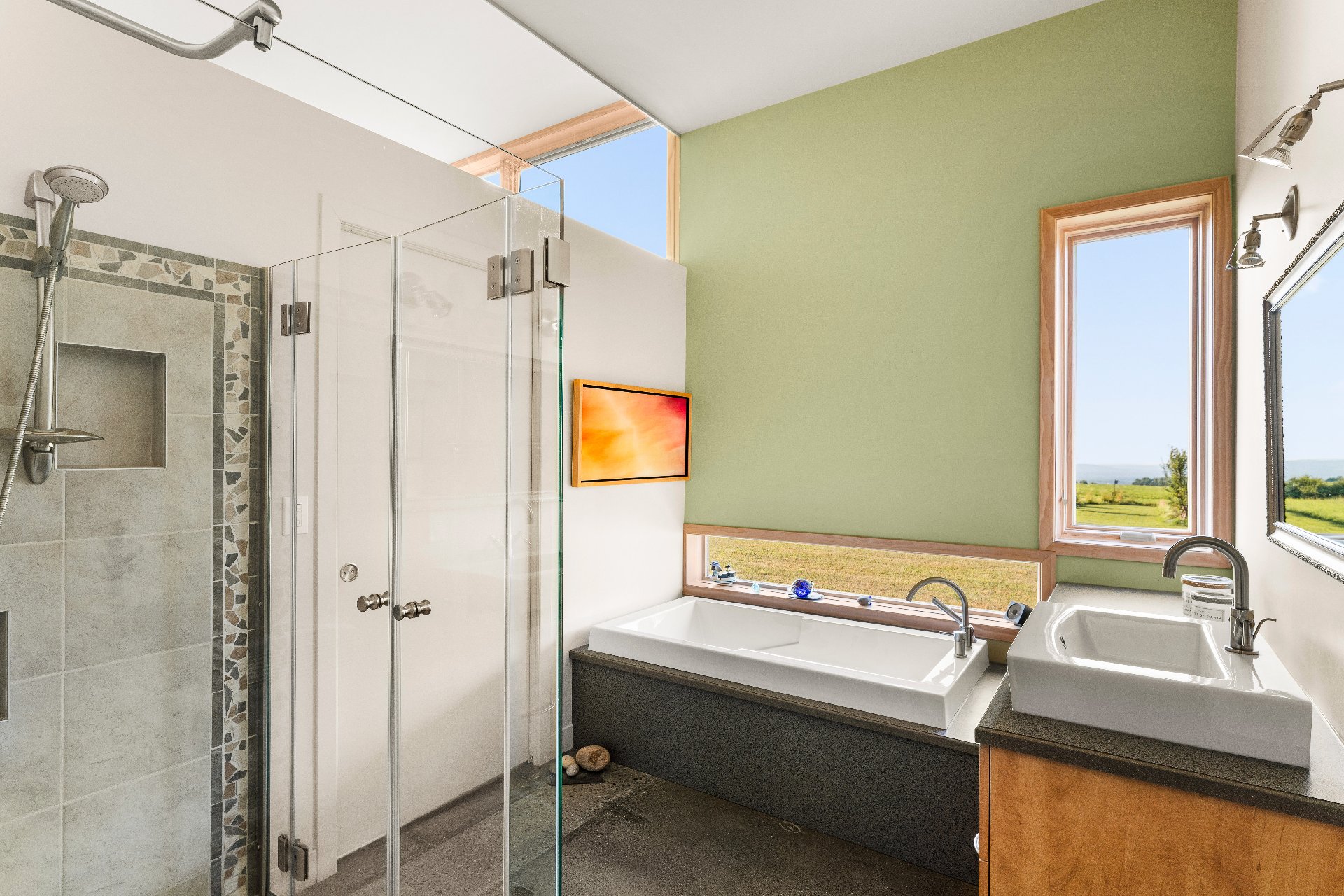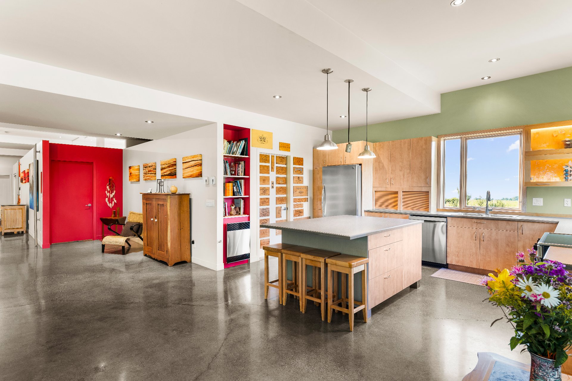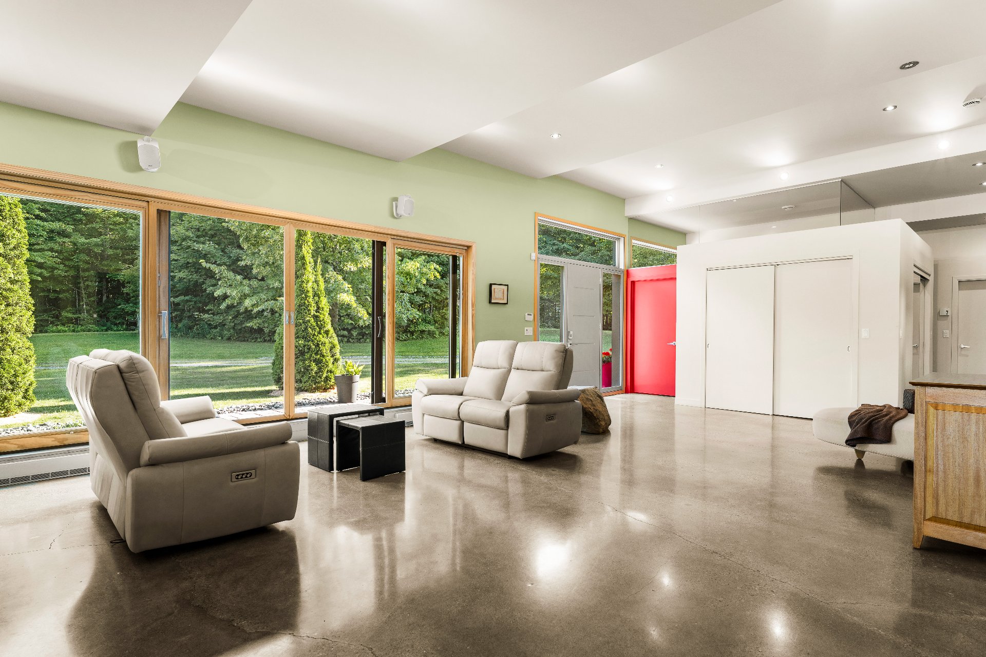 L'intérieur est à la hauteur : fenestration abondante, lumière naturelle omniprésente, foyer central à 4 faces, cuisine avec cellier (350 bouteilles) en érable massif pouvant servir de garde-manger, 3 ch. dont une suite des maîtres avec penderie w.-in, s. d'eau et accès à une s. de bain avec bain et douche en verre. La résidence comprend également une s. technique et un garage simple avec mezzanine de rangement.