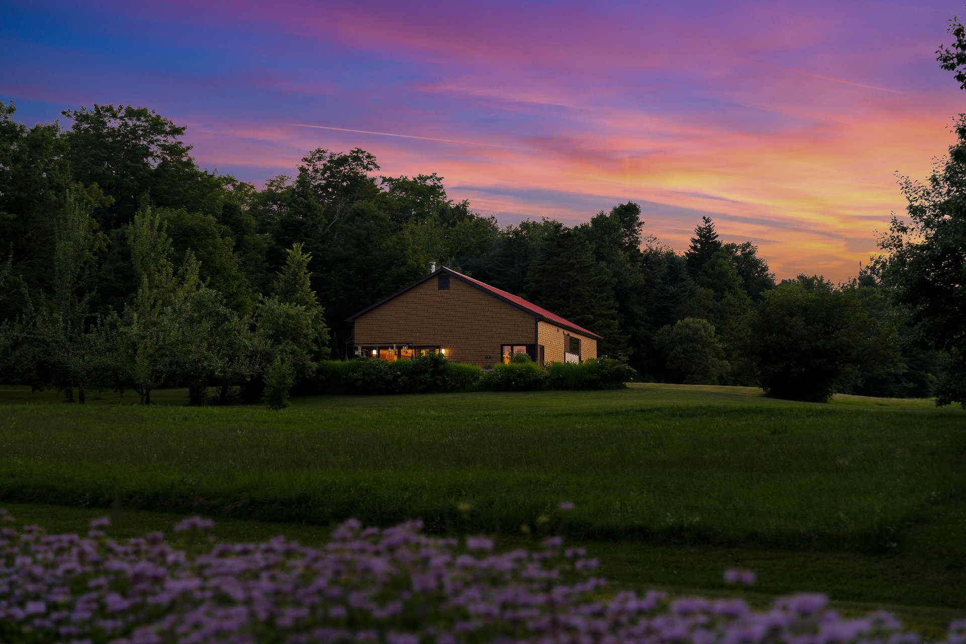 Le bâtiment principal, une ancienne scierie construite en 2000, a été transformé en 2006 par l'architecte Martin Daoust. Il a conçu une résidence à aire ouverte au design spectaculaire, inspiré par les volumes impressionnants de l'ancienne structure et de la vue imprenable sur le Val Saint-François. Seule la toiture, les fermes de toit et la fondation ont été conservées; la résidence a été construite avec des matériaux neufs (plomberie, électricité, divisions, chauffage, etc.).