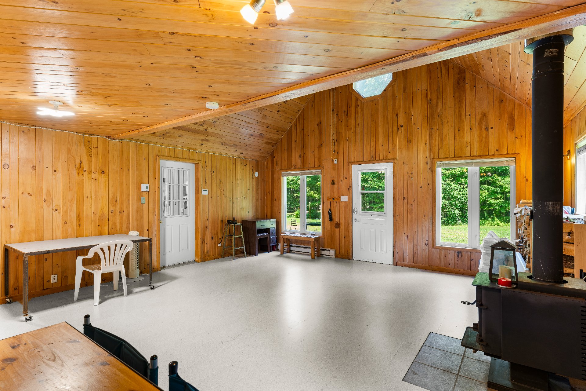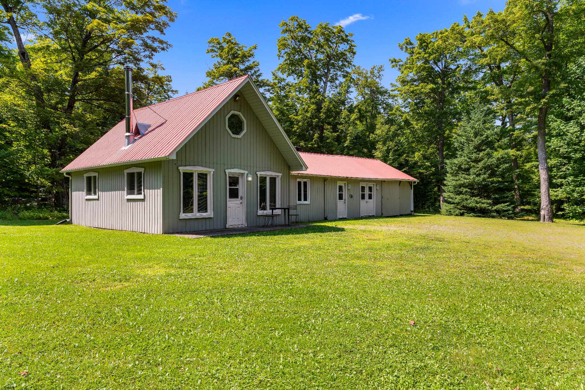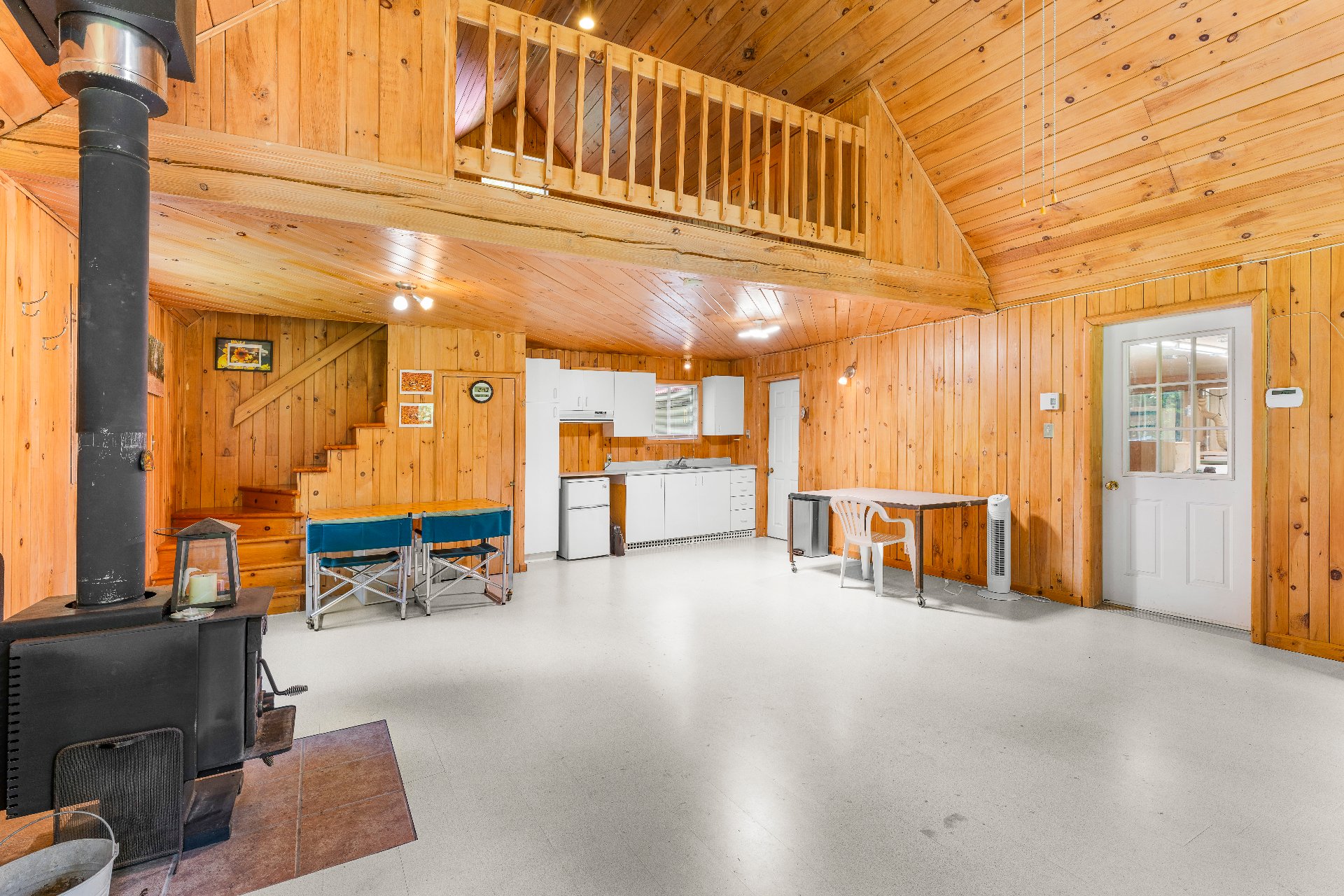 À quelques pas, un charmant chalet d'invités s'ajoute à l'ensemble : toit cathédrale en lambris de bois, aire ouverte de 21x19pi. incluant salon muni d'un foyer à combustion lente, s. à manger, cuisine complète et d'une s. de bain comprenant une douche et une lingerie. Une mezzanine avec meubles encastrés permet d'y aménager une belle chambre. Ce chalet pourrait aisément être offert en location.