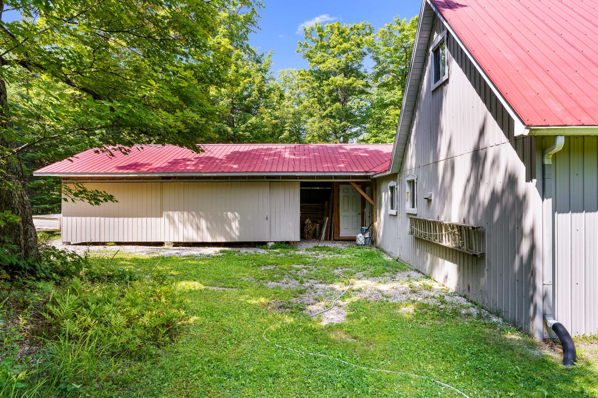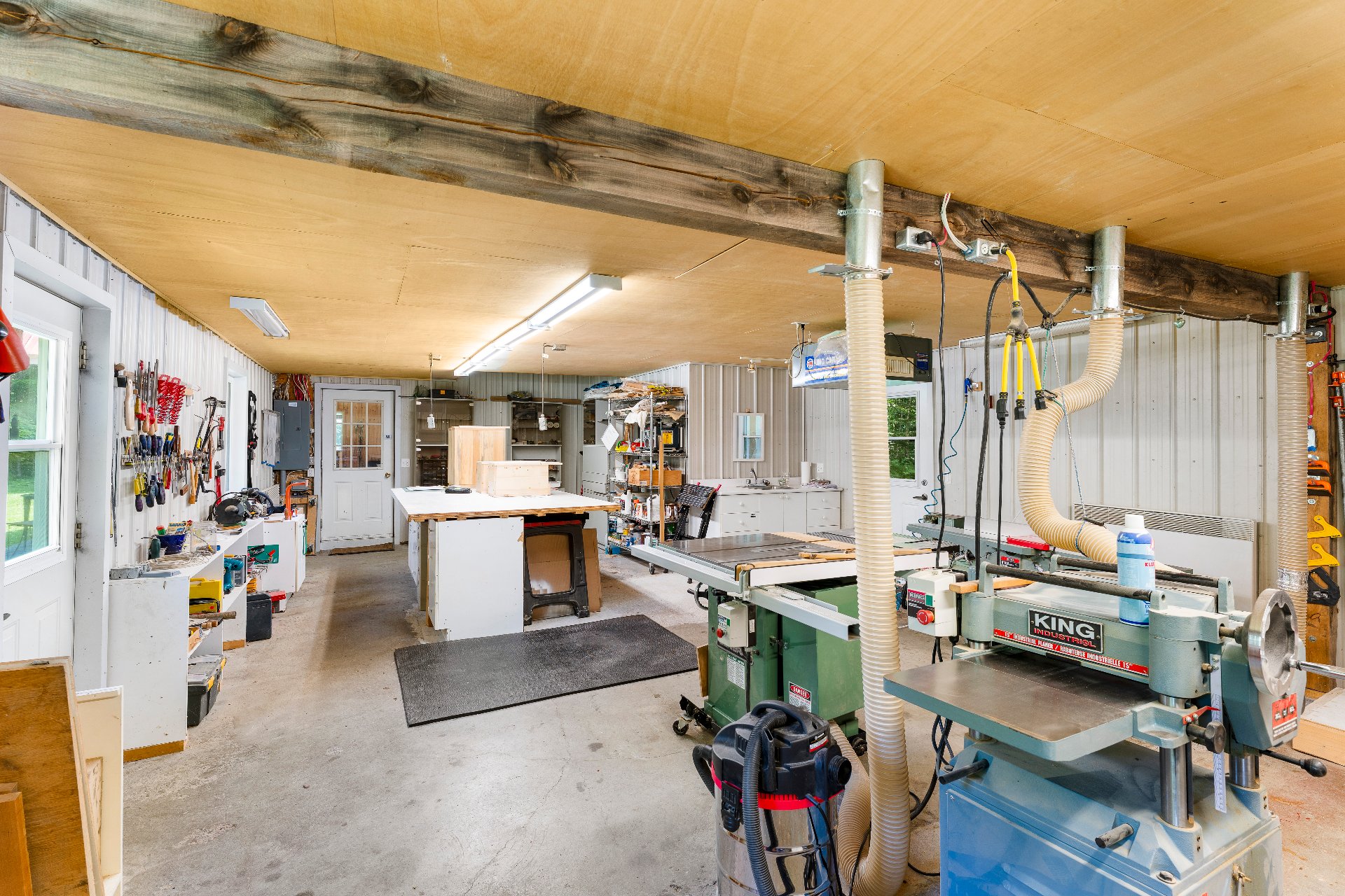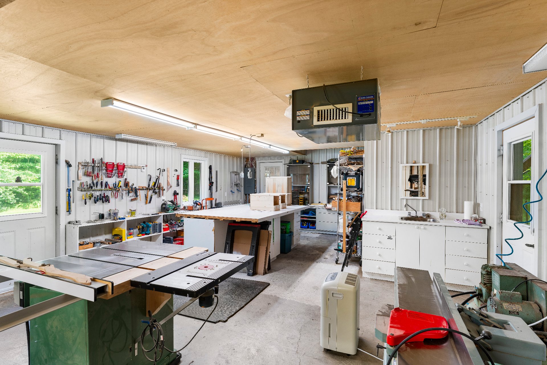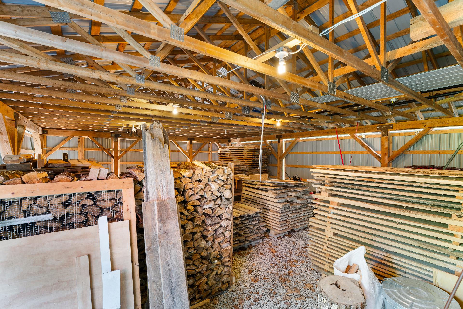 Sur la droite, un vaste atelier de 35x19pi. actuellement utilisé en atelier d'ébénisterie est parfaitement aménagé avec établi central, établi mural et nombreux modules de rangement. Un garage double de 19x16pi. (non chauffé) complète les espaces de travail et de rangement d'équipements. Une remise de 35x26pi. ajoute encore plus de possibilités d'entreposage. Tous les bâtiments, à l'exception de la remise, sont munis d'un système d'alarme relié à une centrale et aux premiers répondants.