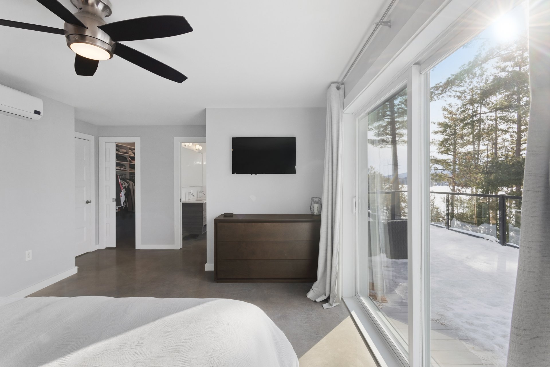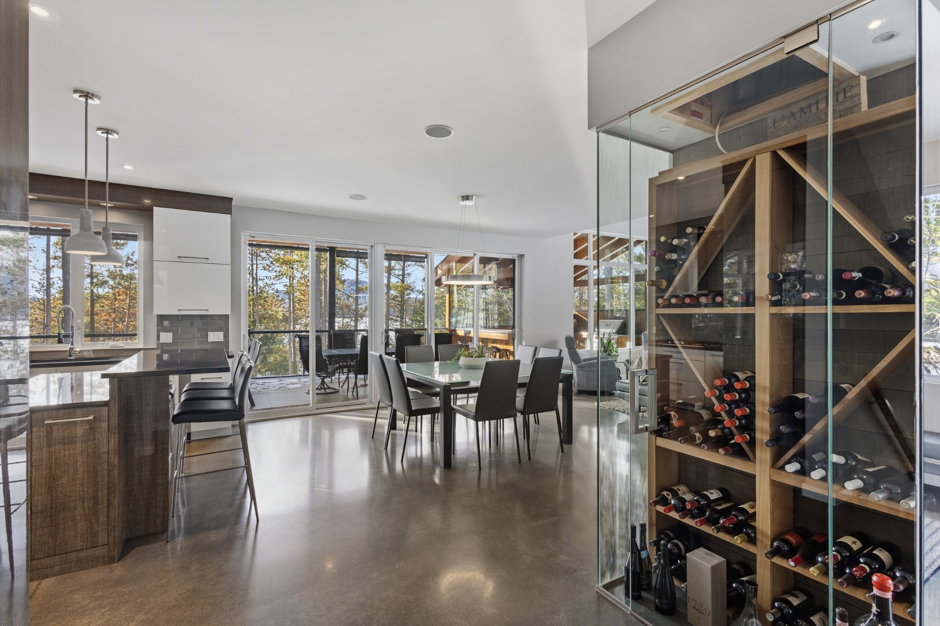 L'Équipe est fière de vous présenter cette propriété d'exception érigée en 2015 sur les rives prisées du grand lac Brompton. Elle incarne une parfaite alliance entre architecture contemporaine, confort absolu et environnement naturel d'une grande beauté. Implantée sur un terrain boisé offrant intimité et sérénité, elle propose un cadre de vie incomparable où chaque espace a été conçu pour maximiser la lumière, les perspectives et le bien-être. Dès l'entrée, un cellier soigneusement intégré annonce le caractère distinctif de la résidence. Le rez-de-chaussée, entièrement aménagé sur dalle de béton avec planchers chauffants, incluant le garage, offre un confort inégalé en toute saison. Les plafonds élevés, dont un plafond de 11 pieds au salon, accentuent l'ouverture des espaces, tandis que la fenestration abondante maximise l'apport de lumière naturelle. Ce niveau regroupe les principales aires de vie, soit le salon avec foyer au bois, la salle à manger, la cuisine, ainsi qu'une salle d'eau et une salle de lavage. À l'étage, l'intimité et le raffinement se poursuivent avec deux superbes suites privées, chacune dotée de sa salle de bains attenante et de son walk-in. La suite des maîtres se distingue par sa vue imprenable sur le lac ainsi que par son accès direct à une terrasse privée, offrant un espace exclusif. Cet étage comprend également un bureau ainsi qu'une salle d'entraînement, ajoutés lors de l'agrandissement réalisé en 2018, parfaitement intégrées à la résidence. Le rez-de-jardin propose des espaces de vie supplémentaires conçus pour la détente et le divertissement, incluant une salle familiale avec accès direct à la terrasse et au spa, une seconde salle familiale avec coin bar, ainsi que deux chambres supplémentaires munies de walk-in et une salle de bains complète. À l'extérieur, les aménagements ont été soigneusement pensés pour profiter pleinement du cadre riverain. La terrasse du rez-de-chaussée accueille une cuisine extérieure complète avec four à pizza au bois, offrant un espace idéal pour recevoir et profiter pleinement de l'environnement naturel et de la proximité du lac. La propriété dispose également d'un garage simple attaché, en plus d'un impressionnant garage triple détaché, véritable espace signature comprenant un espace ''man-cave'' avec lounge raffiné, un simulateur de golf, un coin bar, une table de billard et une salle d'eau - un lieu unique dédié aux loisirs et aux réceptions privées. Alliant design moderne, matériaux de qualité, confort supérieur et emplacement privilégié en bordure du grand lac Brompton, cette propriété représente une opportunité rare d'accéder à un art de vivre où luxe, nature et intimité se rencontrent avec élégance. Nouveau certificat de localisation en production.