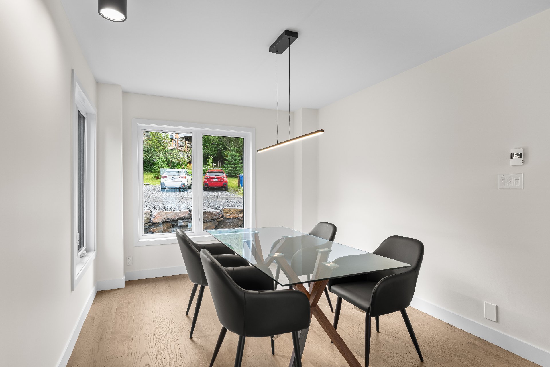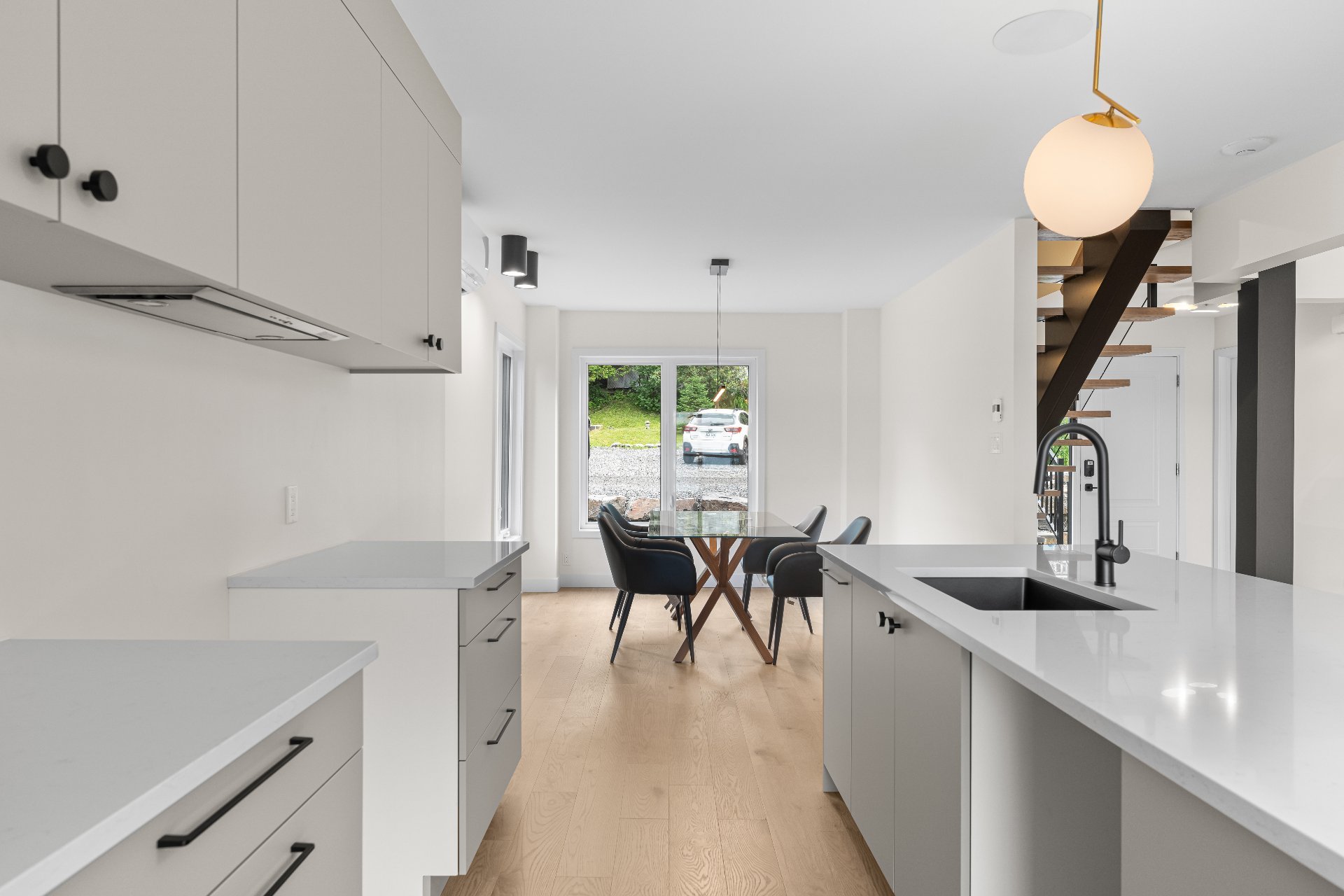 L'aire de vie principale est baignée de lumière grâce à son plafond cathédral et sa généreuse fenestration. Le salon est rehaussé par un superbe foyer au gaz à trois façades, créant une ambiance à la fois raffinée et conviviale. La cuisine neuve se distingue par ses matériaux de qualité, son grand îlot central et ses comptoirs en quartz, parfaite pour cuisiner et recevoir.