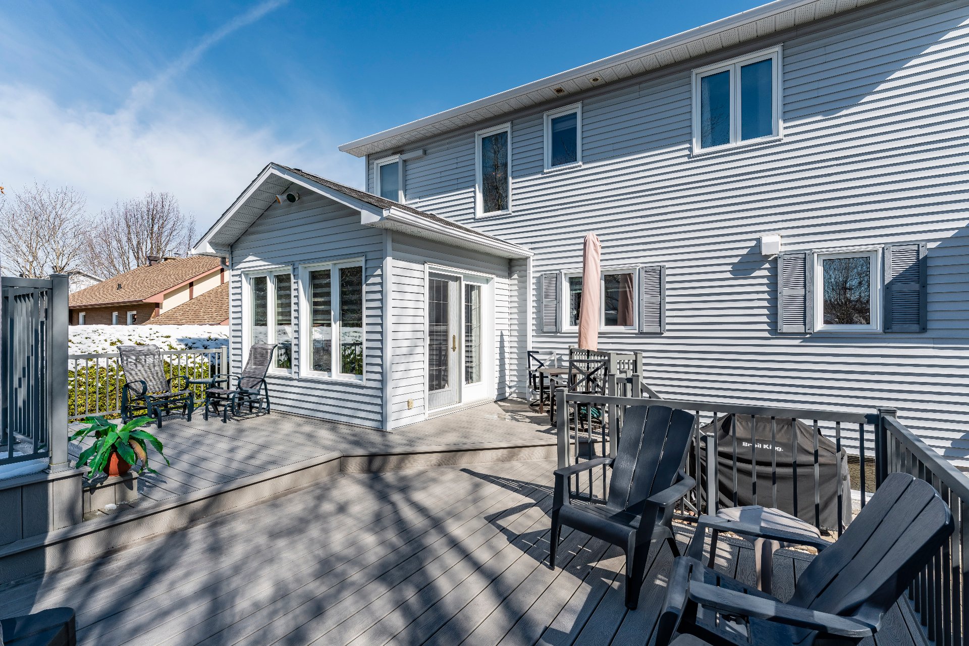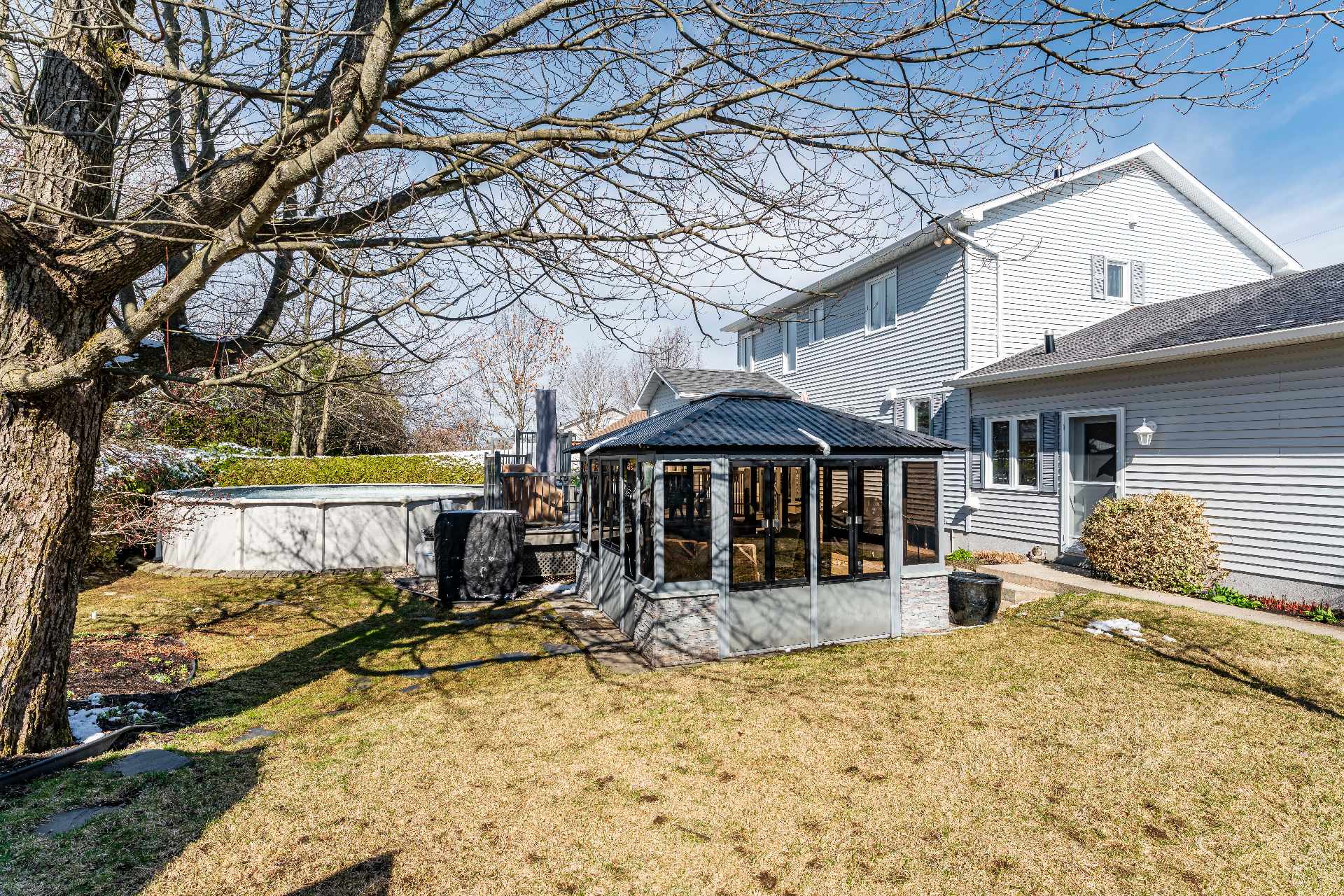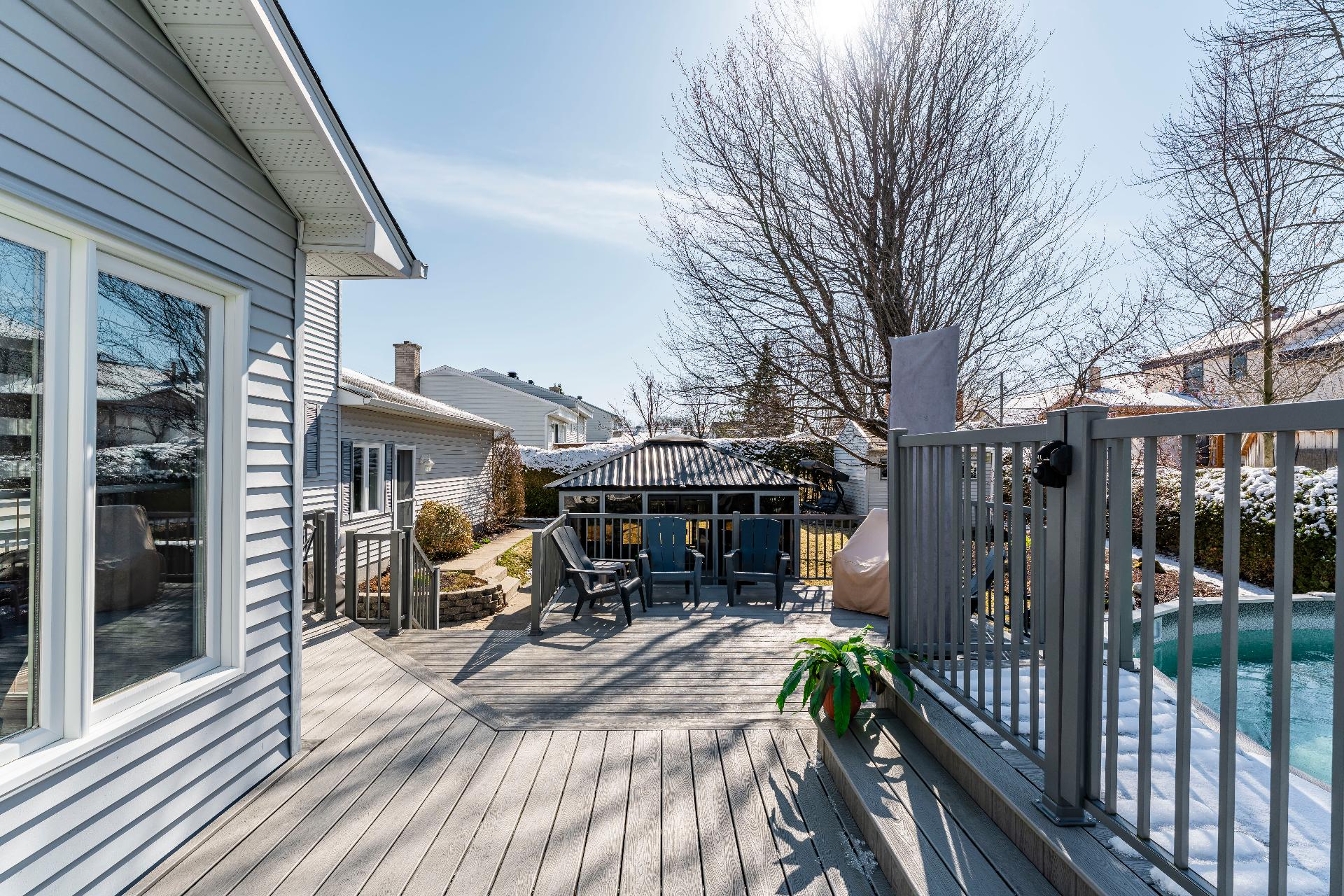 L'Équipe est fière de présenter cette superbe propriété agrémentée d'un aménagement paysagé exceptionnel. Située dans un cartier résidentiel tranquille de Fleurimont, cette propriété offre une quiétude inégalée. La lumière naturelle abondante révèle tous les détails de construction. La propriété bénéficie également d'un emplacement privilégié près de trois parcs et est à proximité immédiate de tous les services essentiels. Son design traditionnel offre un style temporel. La maison est également agrémentée d'une piscine chauffée, une grande terrasse, un gazébo et un grand garage double, faisant de cette demeure un véritable lieu de vie paisible et pratique pour tous les styles de vies. Les premiers pas à l'intérieur de la maison donnent sur un escalier en bois chaleureux qui donne une atmosphère apaisante. Un corridor guide le regard vers la cuisine qui reprend les détails de boiseries de l'escalier avec des caissons en bois avec des dosserets en céramique et un ilot amovible. La grande cuisine lumineuse offre amplement d'espace pour être plusieurs dans la cuisine. Un cadre ouvert donne accès à la salle à manger, introduisant ainsi l'aire de vie ouverte regroupant le salon, la salle à manger ainsi qu'une véranda toute vitrée avec un accès à la terrasse extérieure. Cette aire de vie ouverte fait toute la profondeur de la maison permettant ainsi d'avoir un maximum de luminosité naturelle avec une ambiance de liberté dans les aires de vies communes. Pour compléter l'étage, il y a une salle d'eau avec buanderie attenante, un bureau avec une grande fenêtre et un accès au garage. Le grand garage double est muni d'un évier et est assez spacieux pour stationner deux véhicules tout en laissant amplement de place pour du rangement ou des outils. Au second étage, la suite des maîtres, un vrai nid avec deux fenêtres, offrant une vue sur le cours arrière, laissant entrer les rayons de soleil. La chambre des maîtres est munie de deux garde-robes séparées ainsi qu'une salle de bain complète privée idéale pour une intimité supérieure. Le reste de l'étage est constitué de 3 chambres secondaire desservis par une seconde salle de bain complète. Le sous-sol ouvre sur un foyer au bois naturel invitant des temps de détentes. Ce deuxième salon est parfait pour laisser les couvertes sur les divans pour pouvoir passer du temps en famille ou amis. Il y a également une salle de jeu et une autre salle de bain complète. La salle mécanique est assez grande pour servir de rangement ou d'atelier pour les projets. À l'extérieur, l'aménagement paysagé fait preuve d'une attention soignée. Un assortissement d'arbres et buissons à l'entrée viennent se mélanger à la façade pour donner une touche de nature au bâtiment. Toutes la cours arrière est protégée par une grande haie de cèdre mature, offrant une intimité des voisins. L'aménagement paysagé se poursuit à l'arrière avec un grand arbre qui permet d'avoir des portions d'ombre dans la cour arrière.