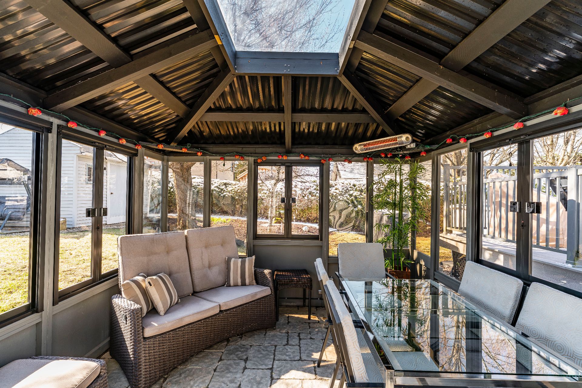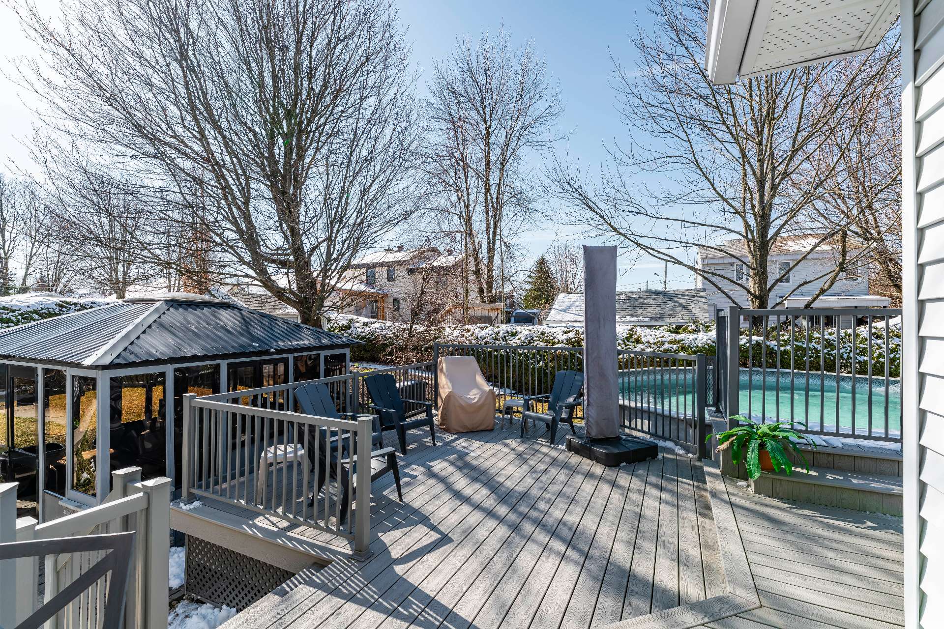 Luminaires, Stores, toiles, lave-vaisselle, cuisinière, réfrigérateur, laveuse-sécheuse, aspirateur central et ses accessoires, piscine hors terre (24'), thermopompe et ses accessoires (piscine), pavillon de jardin, congélateur (sous-sol) et système d'alarme.