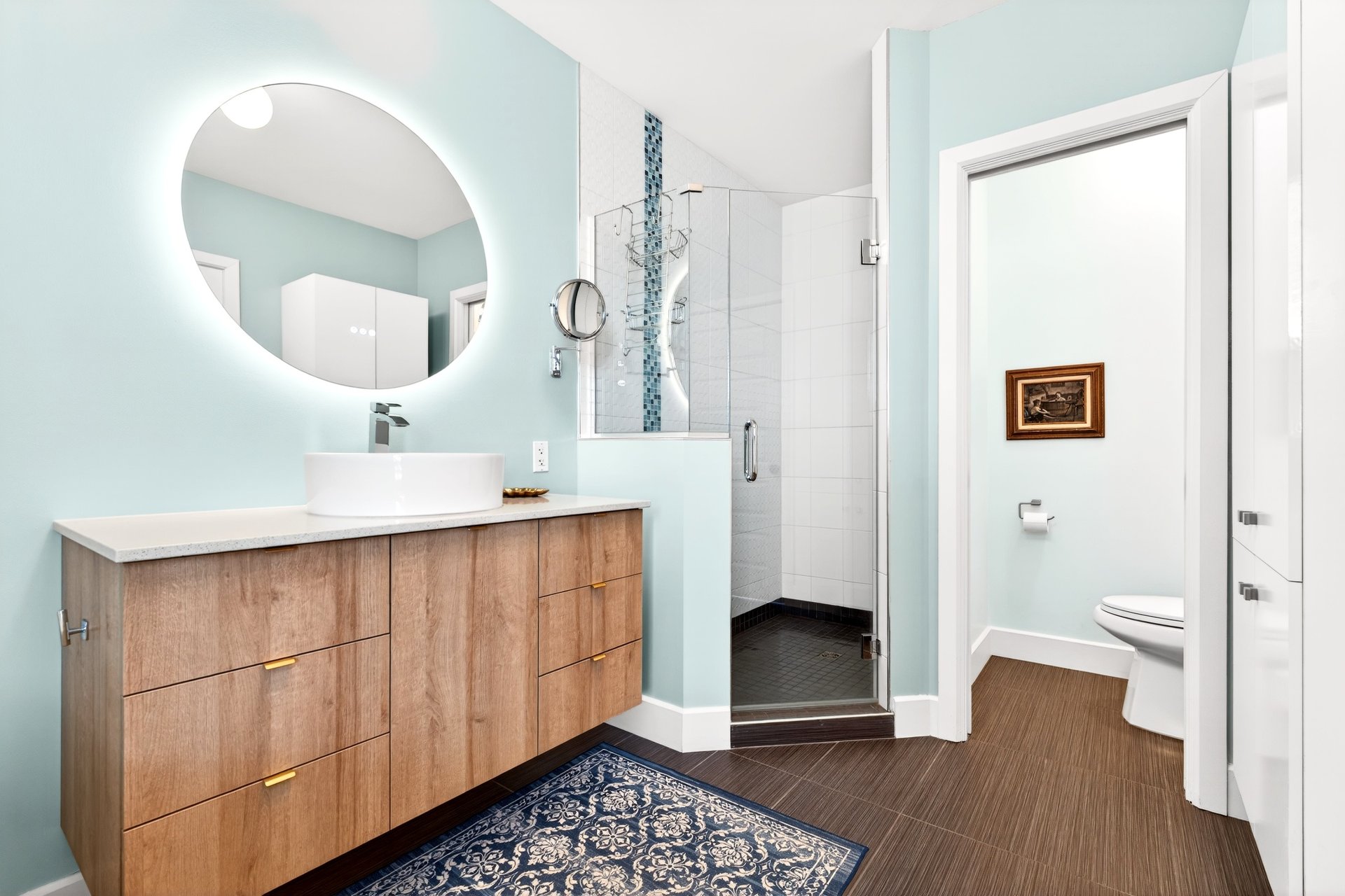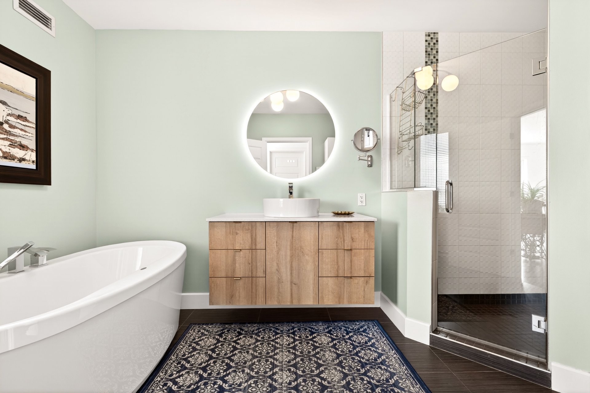 Les biens et effets personnels des vendeurs, luminaire noir de la mezzanine à l'étage, télévisions, miroir rond grossissant attaché de la salle de bains à l'étage.
