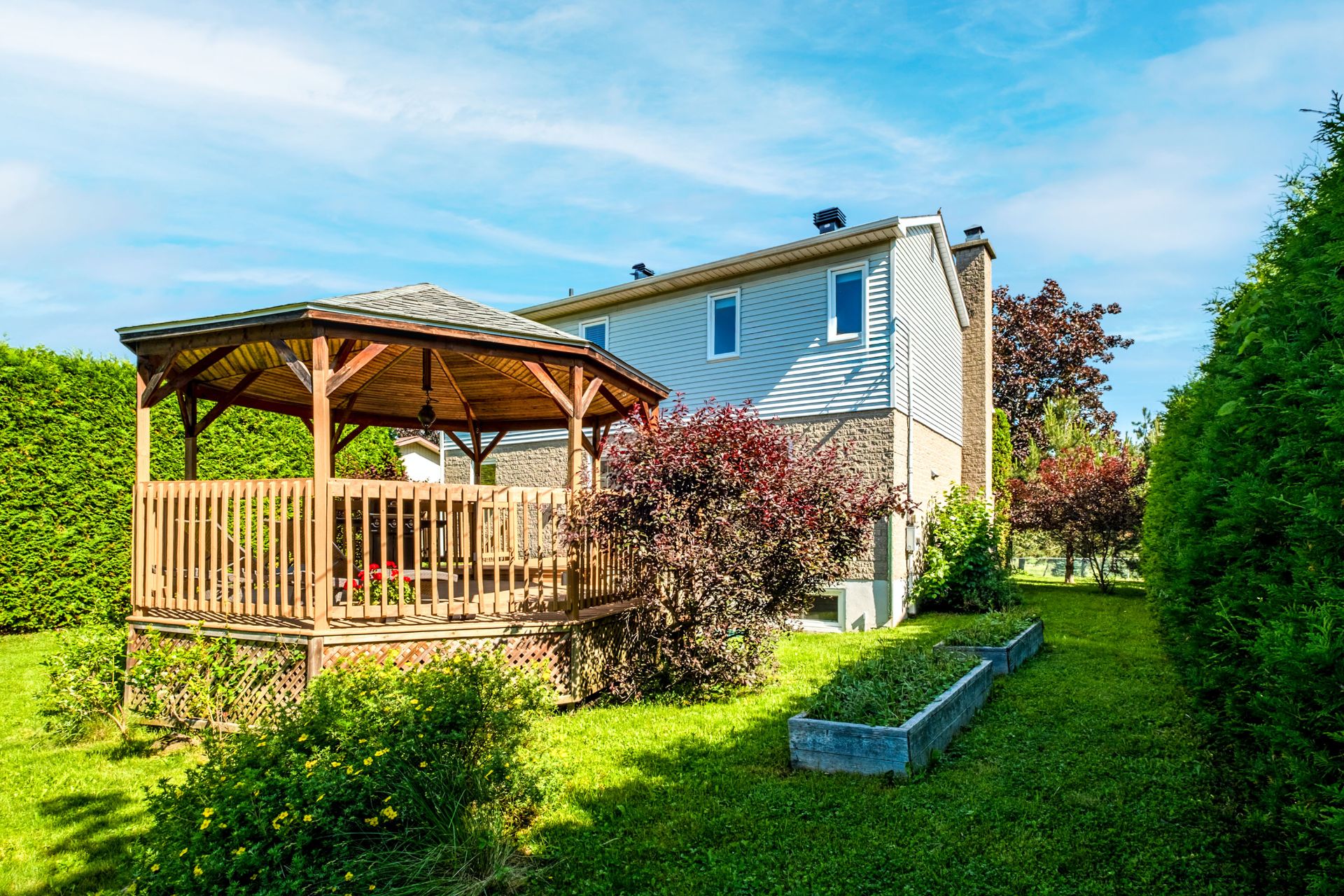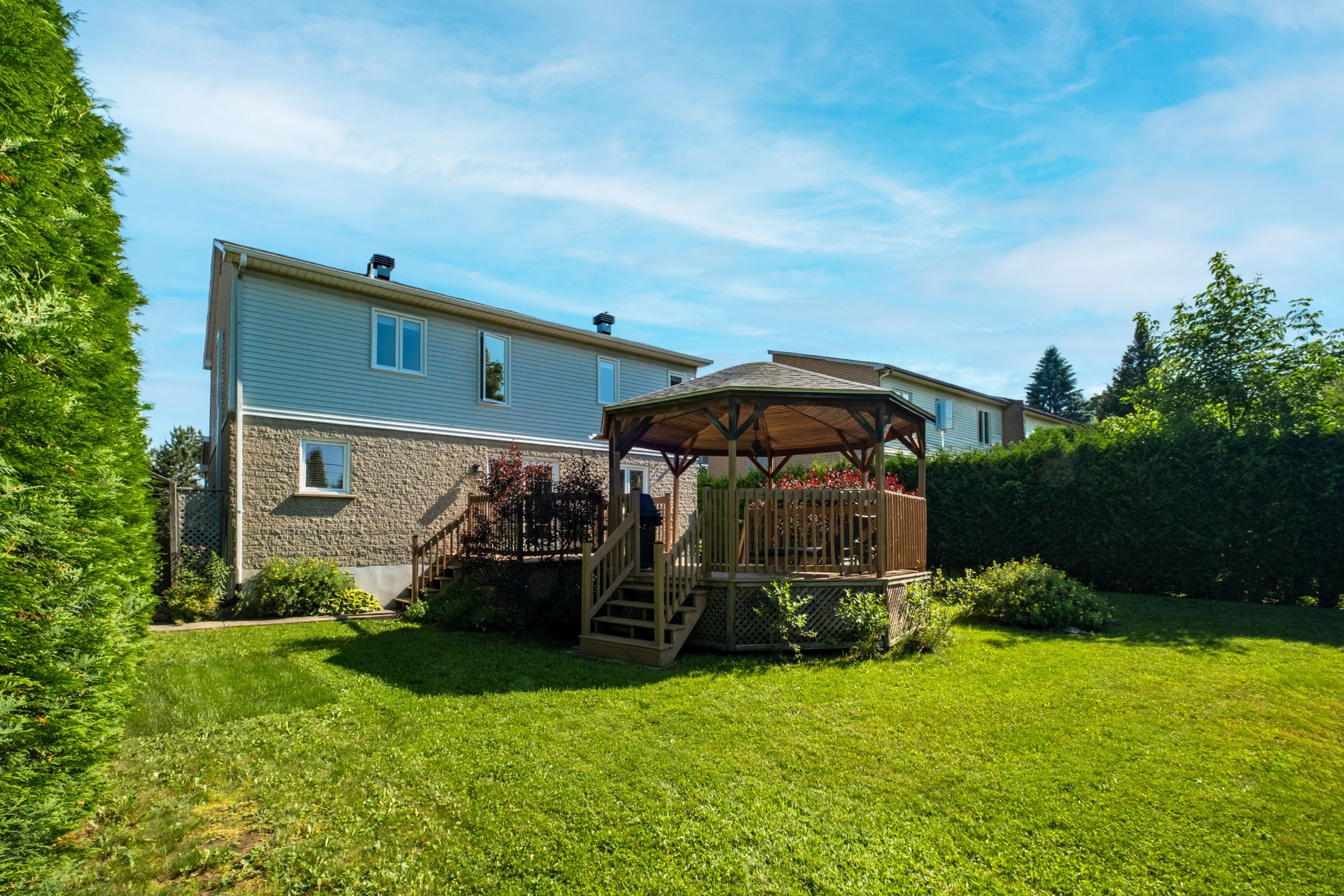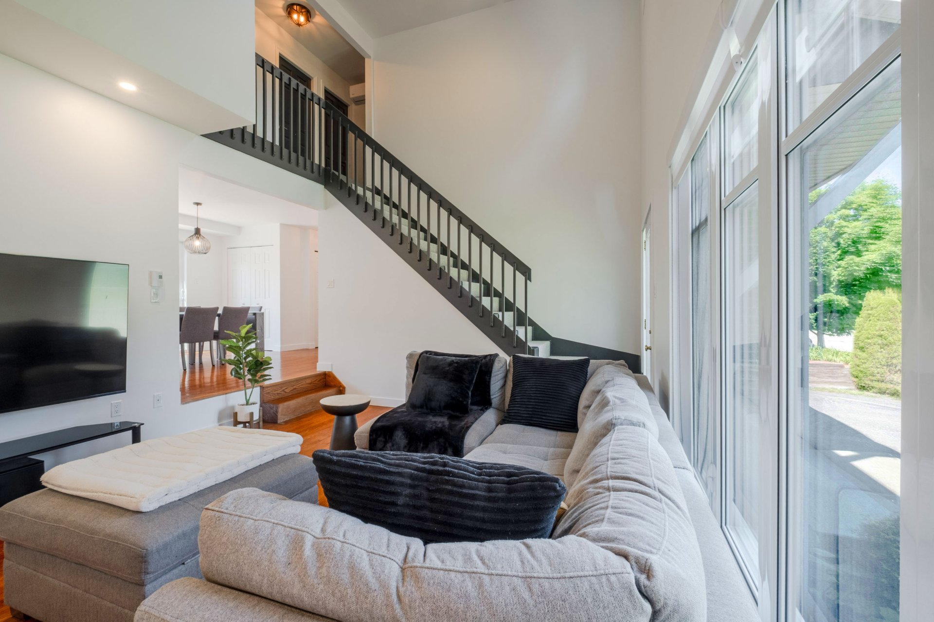 L'Équipe est fière de présenter cette splendide propriété, idéalement située face au prestigieux Golf de Sherbrooke, dans le prisé arrondissement des Nations. À seulement 7 minutes du centre-ville et du parc Jacques-Cartier, elle offre un emplacement stratégique alliant tranquillité, nature et proximité des services essentiels. Cette demeure impressionne par son garage intégré, ses hauts plafonds et son terrain exceptionnellement intime, offrant un cadre de vie à la fois élégant et paisible. Dès l'entrée, l'effet de grandeur se fait sentir grâce aux plafonds élevés, au foyer en briques et au concept à aire ouverte reliant harmonieusement les pièces principales. Au deuxième palier, une cuisine moderne et lumineuse avec îlot central ravira les passionnés de gastronomie, accompagnée d'une salle à manger conviviale. Le rez-de-chaussée comprend également une salle d'eau avec douche, ainsi qu'un accès direct au garage. À l'étage, une élégante mezzanine surplombe le salon et mène à la chambre des maîtres, sublimée par un mur en bois qui ajoute chaleur et cachet. Deux autres chambres polyvalentes complètent l'espace, parfaites pour un bureau ou une chambre d'amis. Deux d'entre elles disposent d'une garde-robe double, tandis que la troisième offre un rangement simple. L'étage se conclut par une superbe salle de bains avec baignoire, agrémentée d'un meuble-lavabo en bois massif offrant un généreux espace de rangement. Au sous-sol, un vaste espace à aire ouverte offre un potentiel remarquable pour aménager une salle de cinéma maison, une salle de jeux, un bar ou tout autre projet sur mesure. Un demi-mur en bois au design contemporain crée une séparation subtile et esthétique, tout en structurant intelligemment l'espace. Du rangement pratique complète ce niveau polyvalent et convivial. À l'extérieur, des arbres matures à l'avant et de hauts cèdres à l'arrière assurent une intimité remarquable et une ambiance naturellement apaisante. Une vaste galerie à deux sections, dont une partie couverte, offre l'endroit parfait pour aménager un coin repas et un espace détente. La cour arrière comprend également un charmant espace de jardinage ainsi qu'une remise pratique pour le rangement. La présente vente est faite sans la garantie légale de qualité, aux risques et périls de l'acheteur. La consommation d'électricité est fournie par Hydro-Sherbrooke.