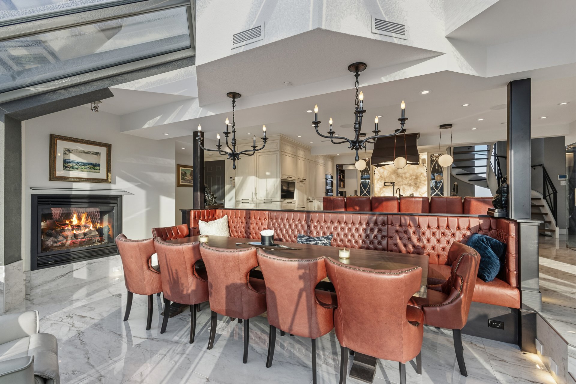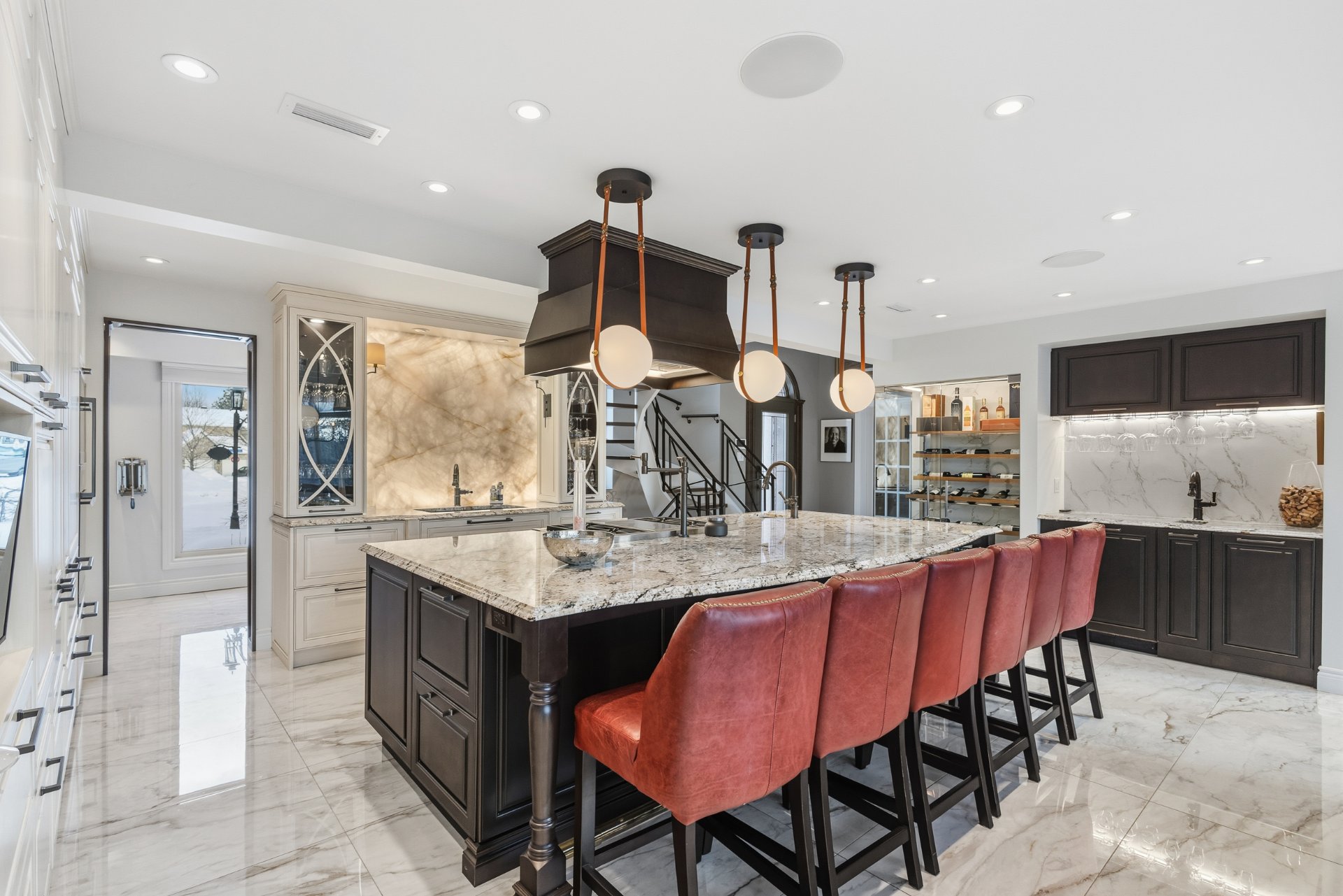 Au rez-de-chaussée, le hall d'entrée prestigieux accueille immédiatement avec sa cage d'escalier spectaculaire, annonçant le ton de la demeure. Le salon chaleureux avec son foyer, la salle à manger élégante avec vue sur la rivière et surtout la vaste cuisine pensée pour les réceptions, accompagnée d'une arrière-cuisine pratique, créent un espace convivial et fonctionnel, parfait pour recevoir en toute élégance. Une salle d'eau et une salle de lavage complètent ce niveau avec raffinement.