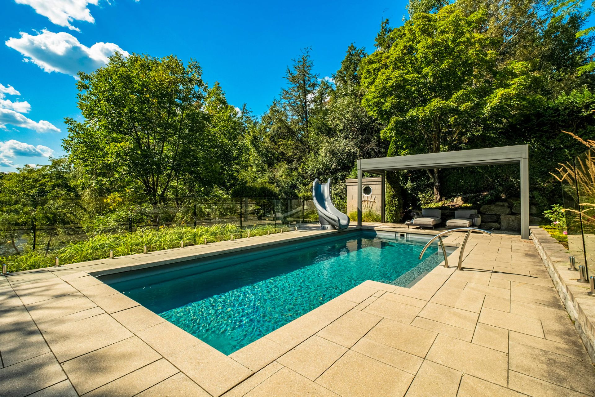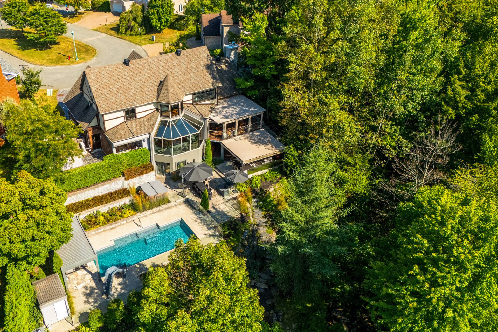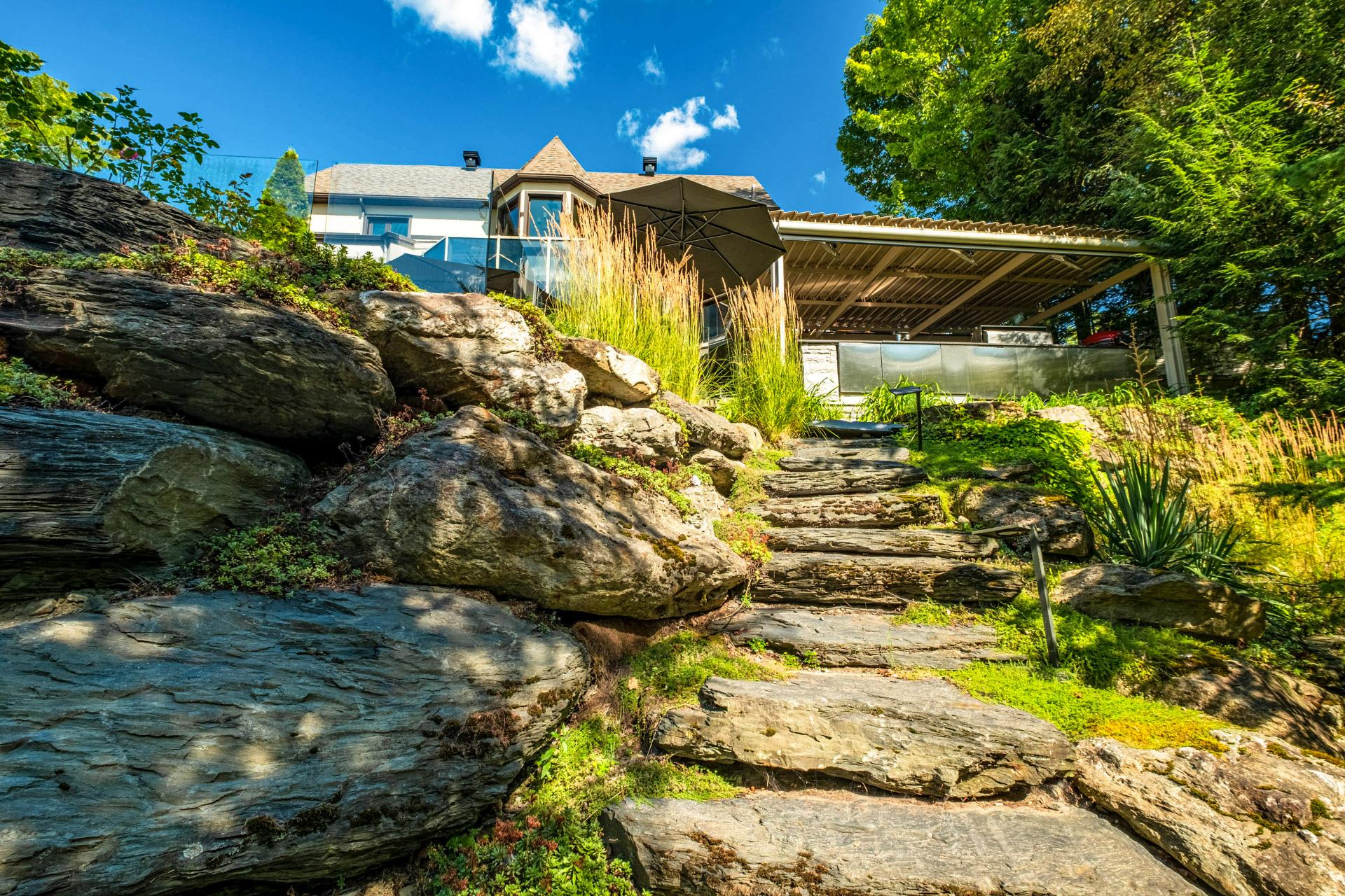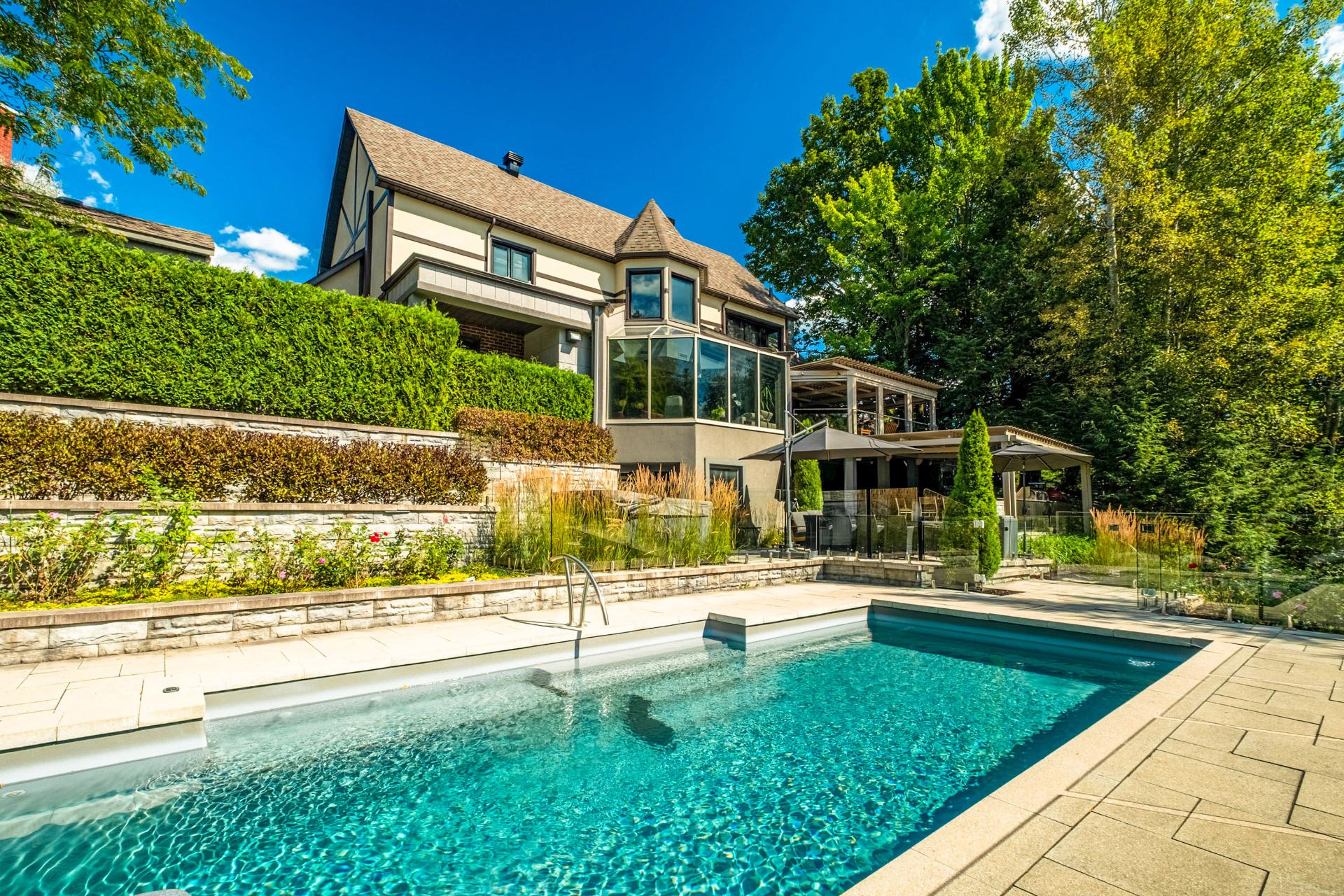 À l'extérieur, la propriété séduit par sa piscine creusée offrant une vue imprenable sur la rivière Magog, ses terrasses multi-paliers et sa cuisine d'été couverte, idéales pour profiter de moments conviviaux en famille ou entre amis dans un cadre enchanteur. Le terrain, agrémenté d'arbres matures et d'une abondante végétation, assure intimité et sérénité. Son entrée en pavé chauffé apporte un confort maximal. Le garage double digne d'une salle de montre ajoute une touche spectaculaire.
