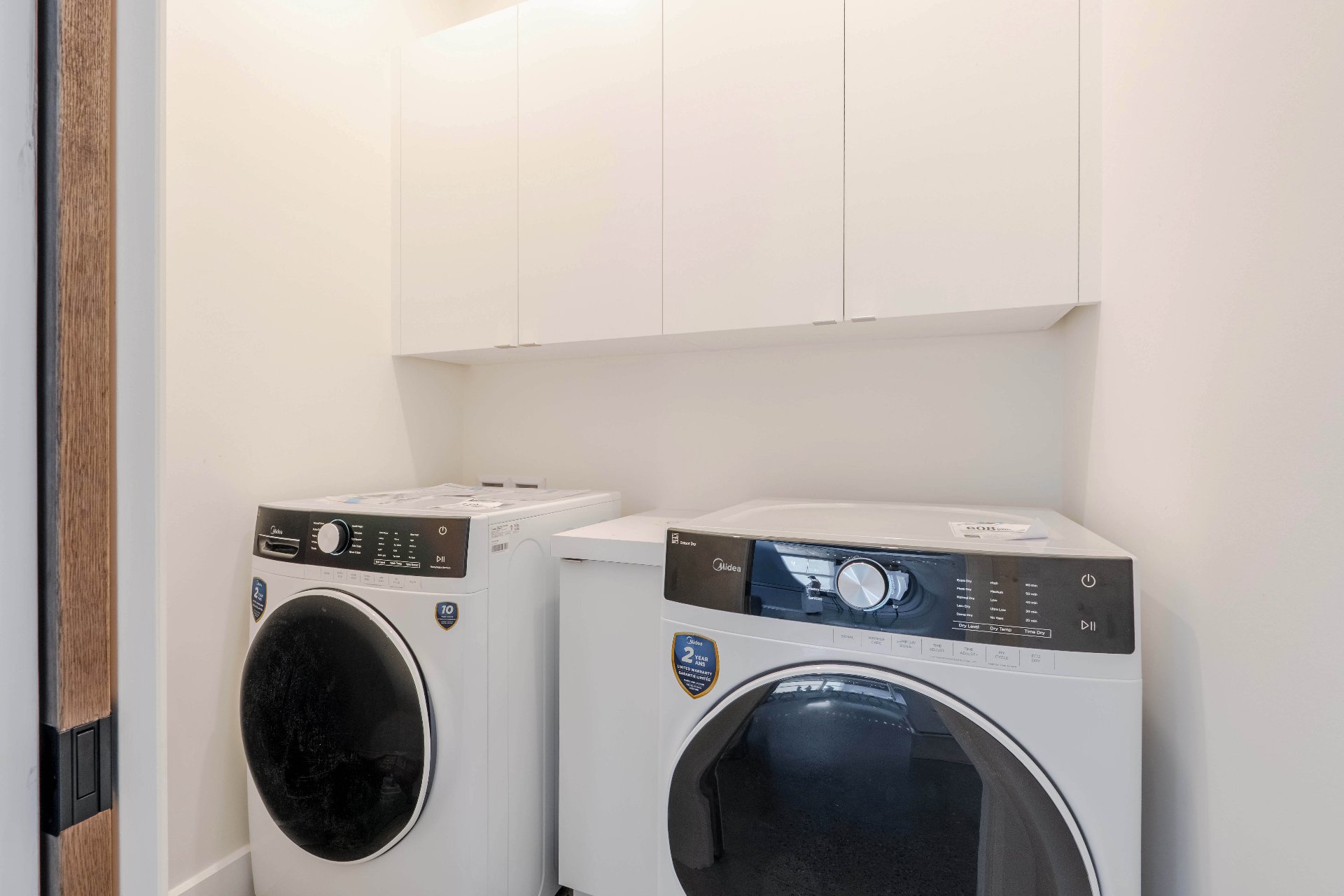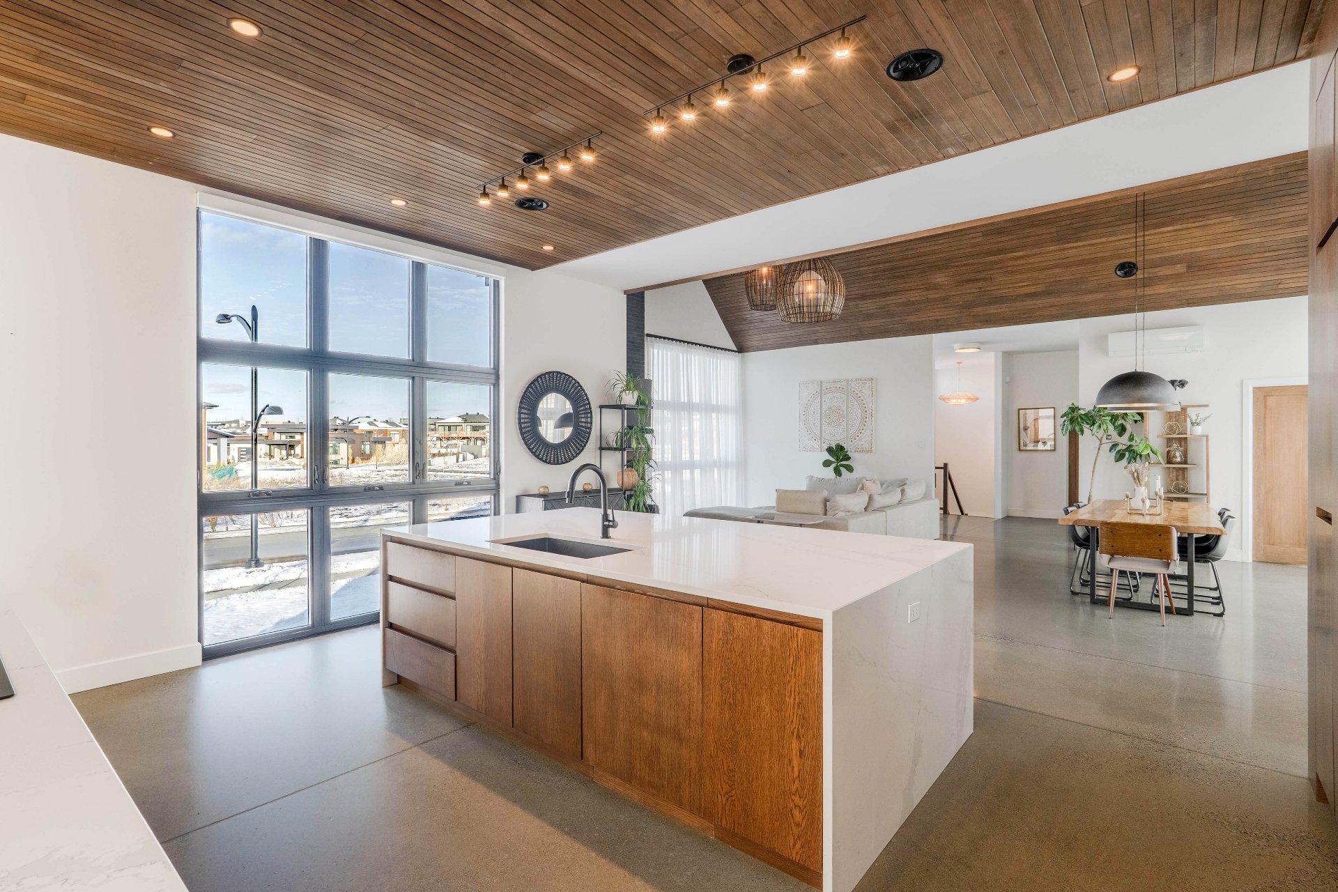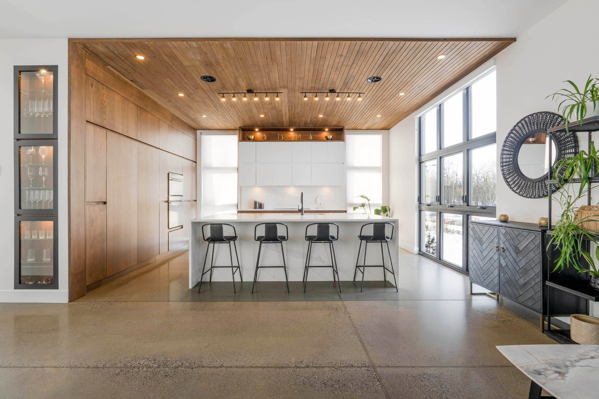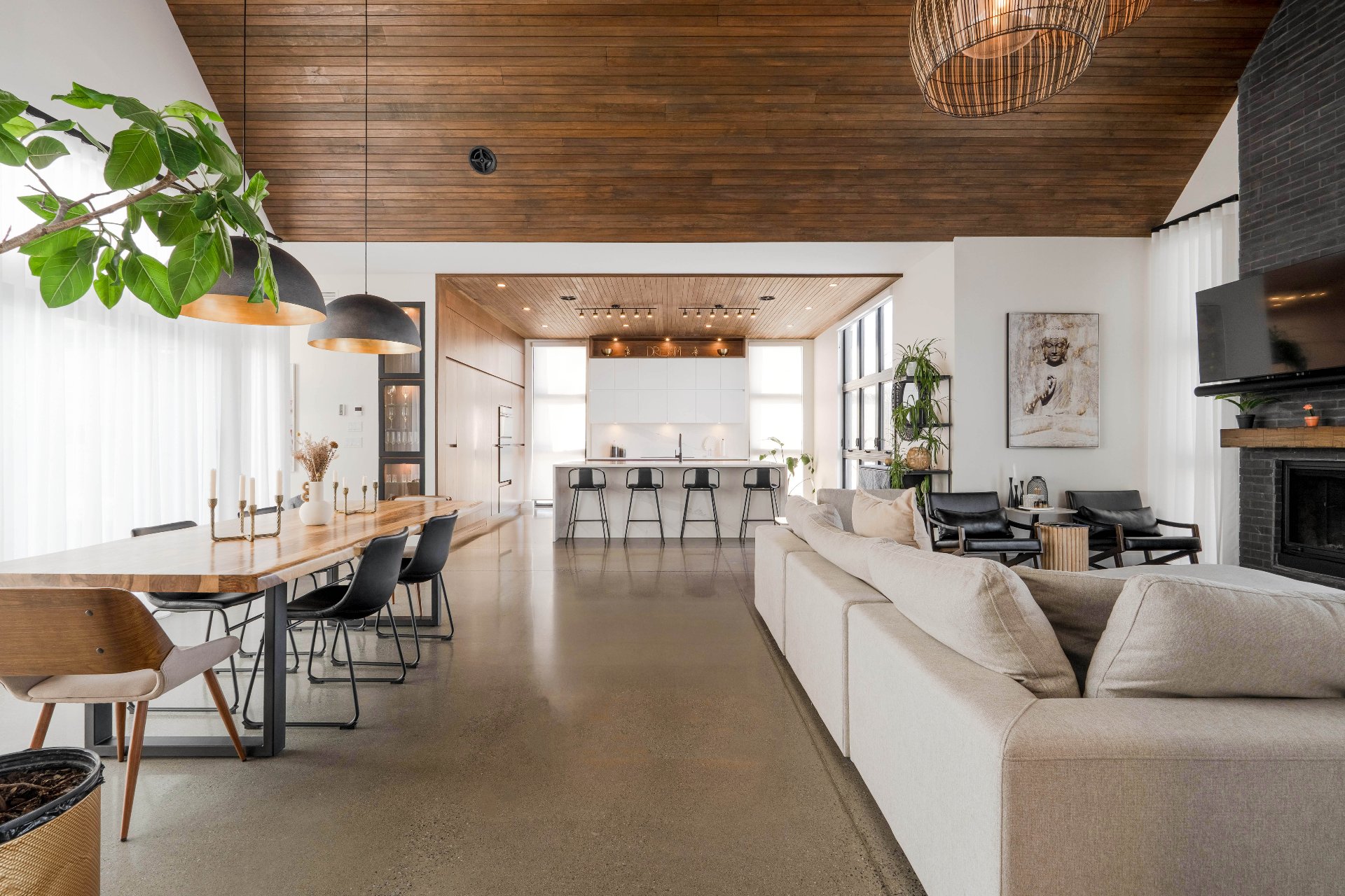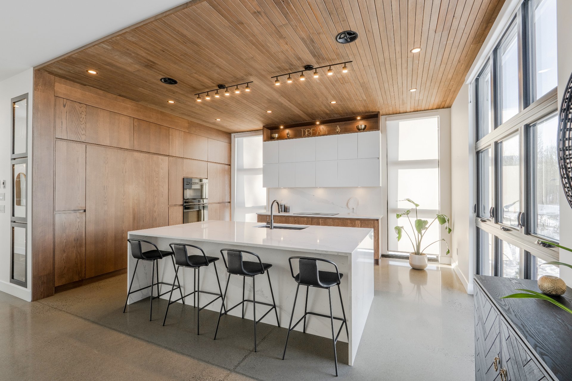 Dès l'entrée, un vaste vestibule mène à l'aire ouverte principale où le salon impressionne avec son plafond voûté de 18 pieds en lattes de bois, tandis que les plafonds du rez-de-chaussée dépassent 10 pieds. La cuisine au design exceptionnel propose des électroménagers intégrés de haute qualité, un immense îlot central ainsi qu'un espace station café intégré, idéal pour les amateurs. La salle à manger peut accueillir confortablement une grande tablée, alors que la fenestration abondante et haut de gamme inonde l'espace de lumière naturelle.
