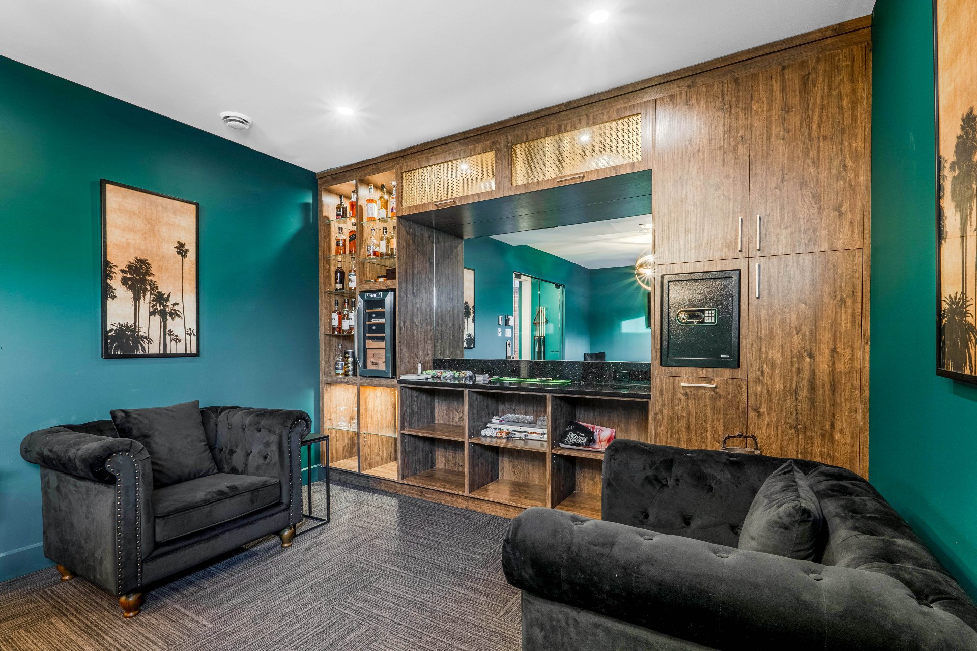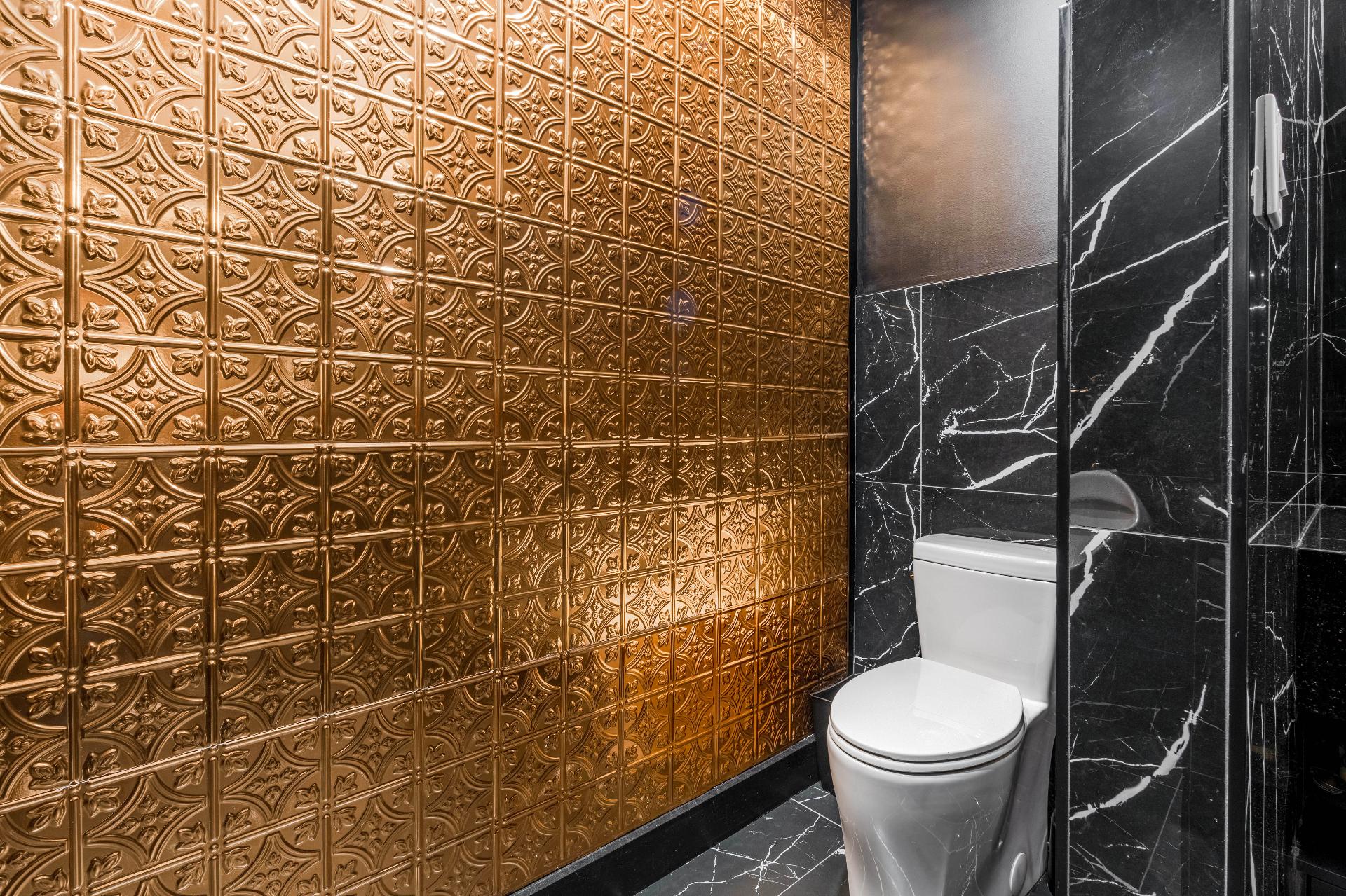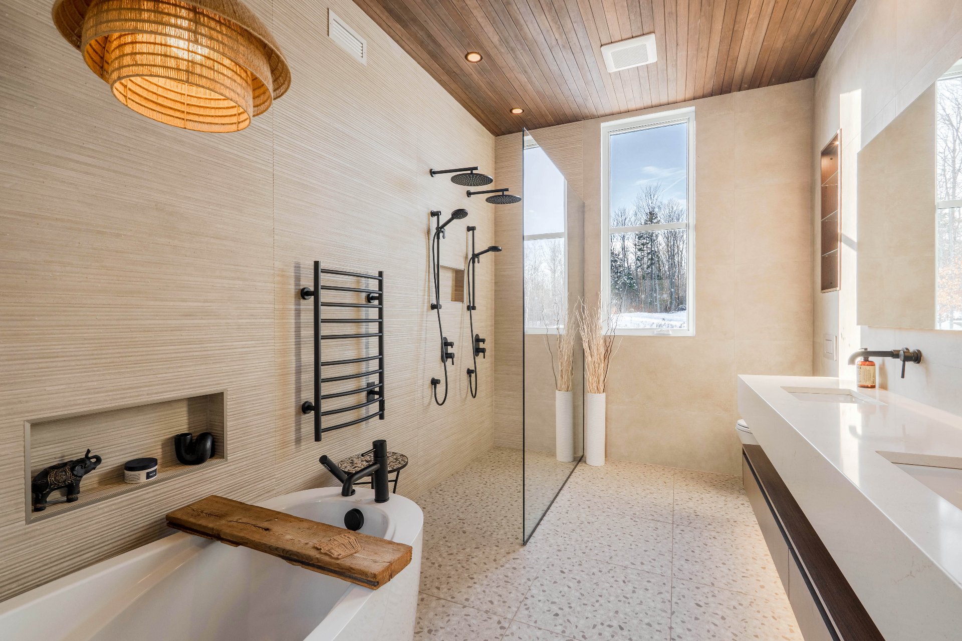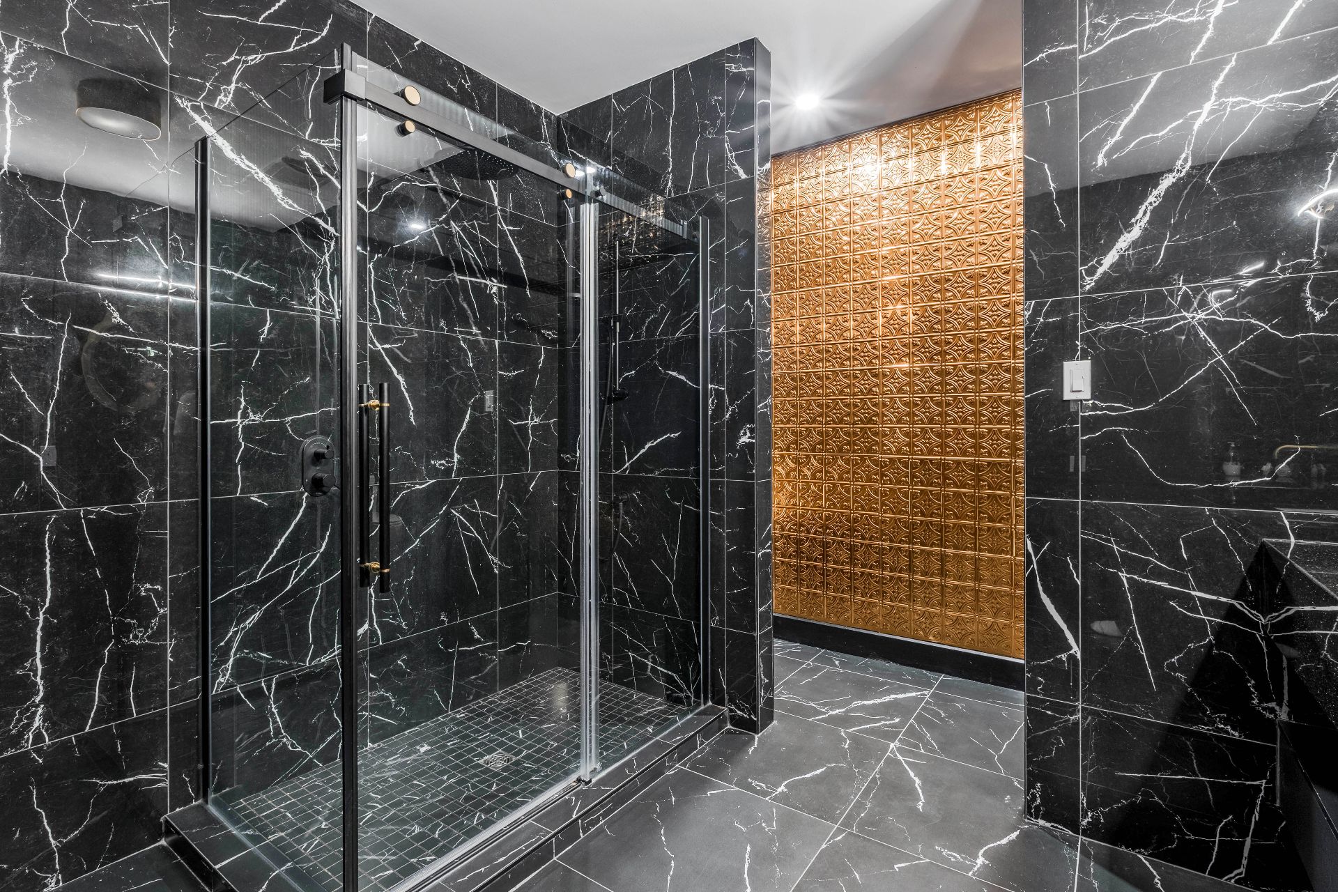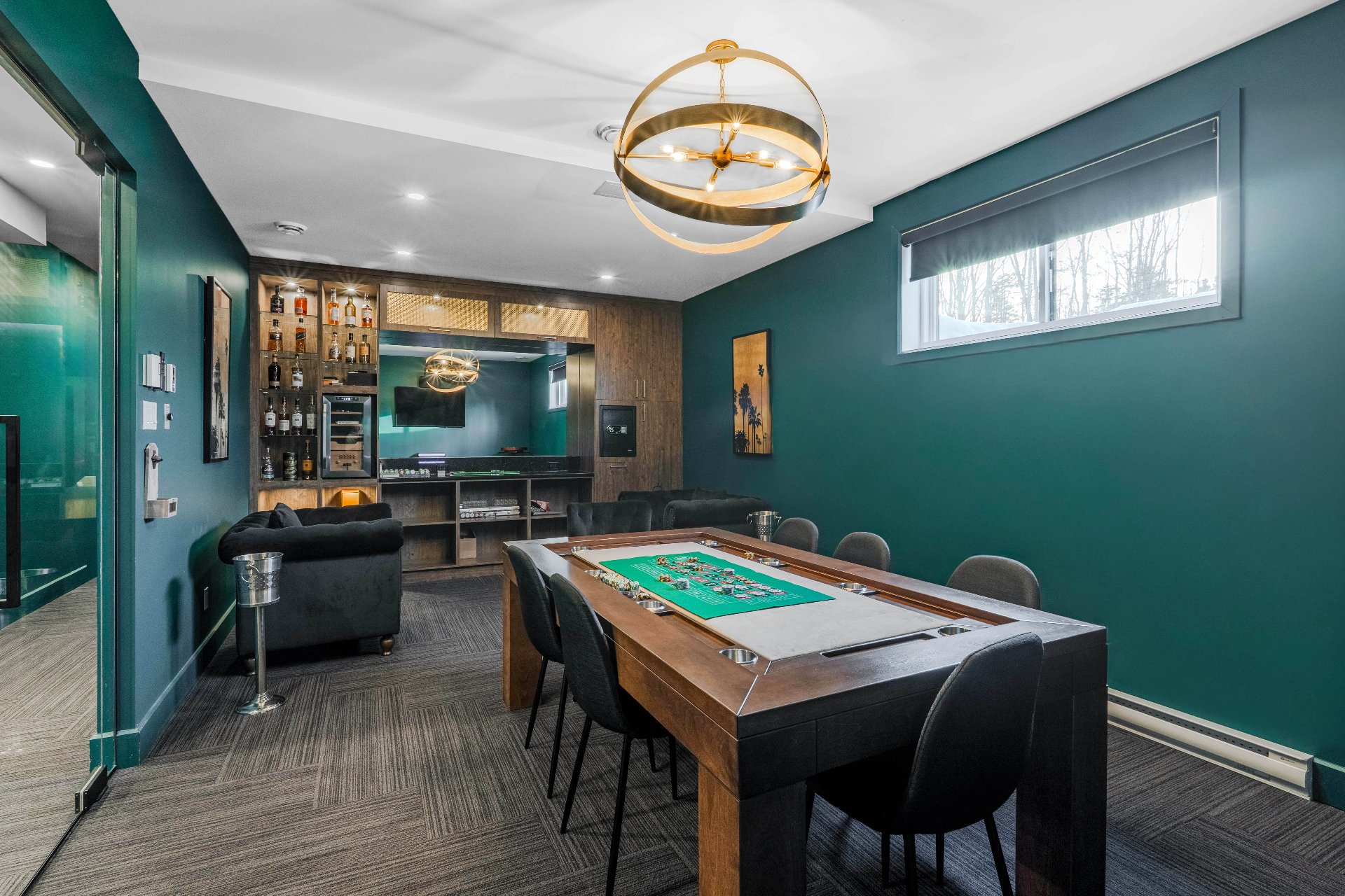 Le sous-sol entièrement aménagé offre une ambiance lounge remarquable avec coin bar, foyer au gaz et espace détente. Une chambre a été aménagée en salle de jeux avec mobilier intégré, offrant une grande polyvalence. La salle de bains du sous-sol, au style luxueux, impressionne par ses finis d'aspect marbre foncé et sa douche indépendante. Une chambre avec walk-in permet d'y accueillir famille ou invités dans un confort absolu.
