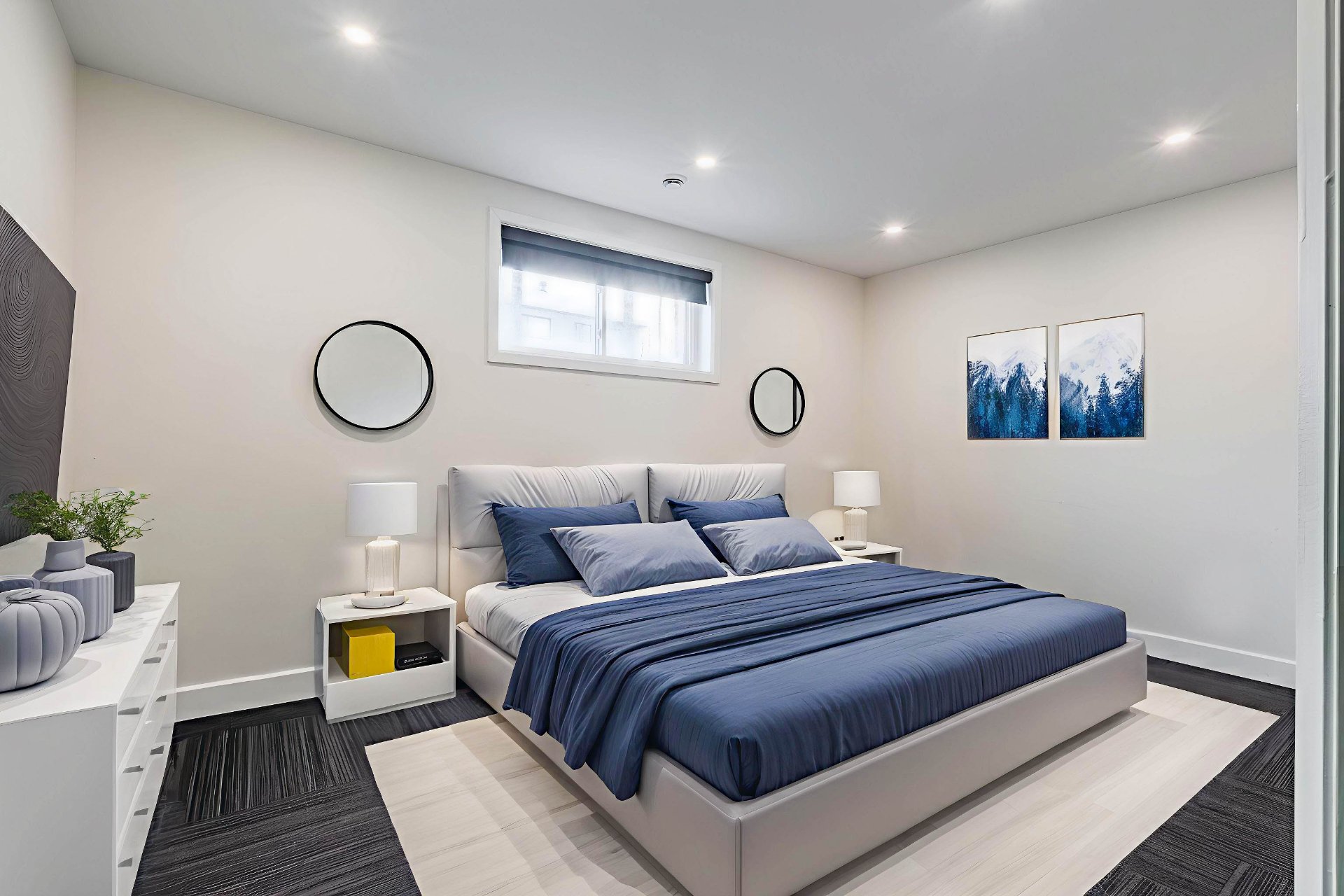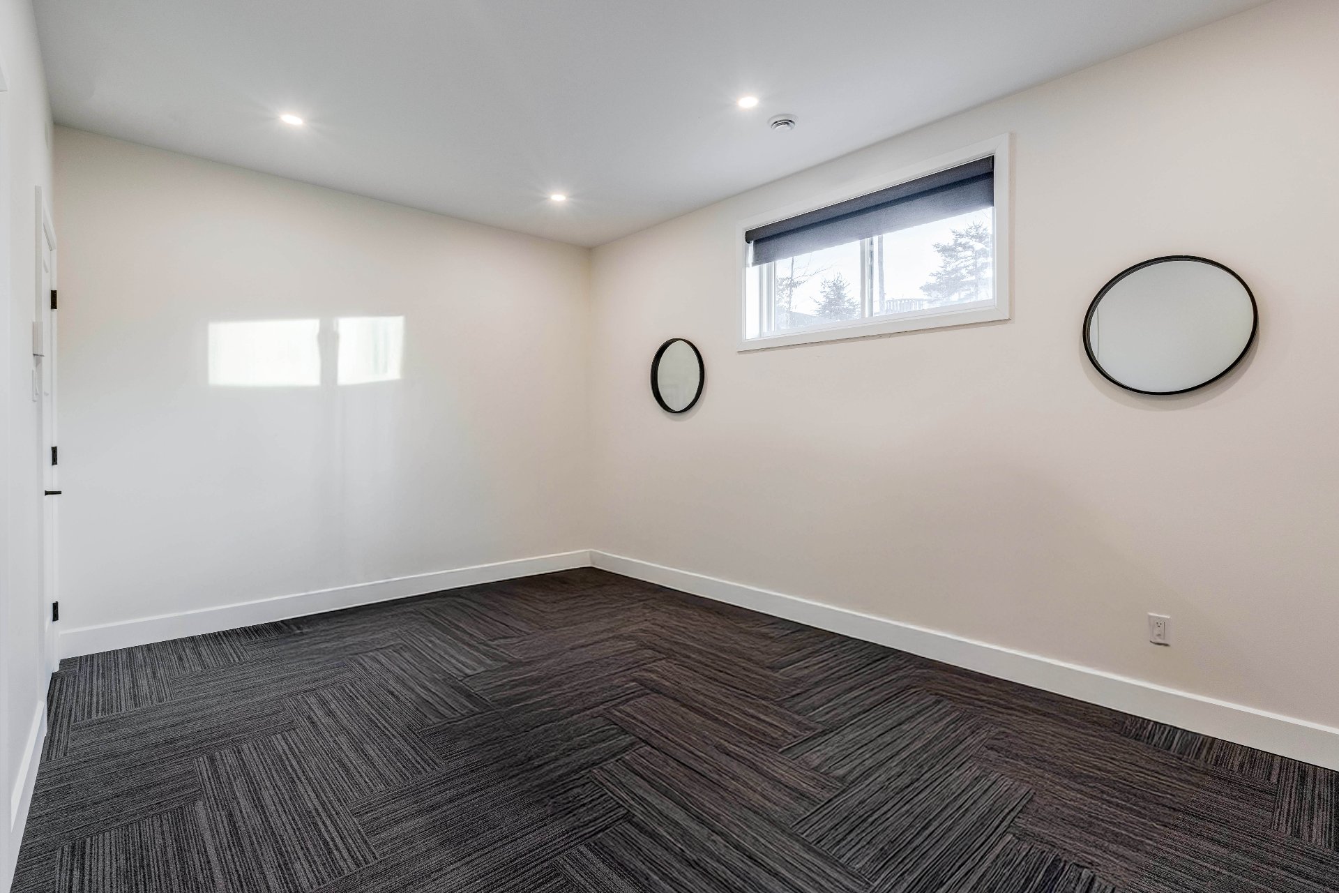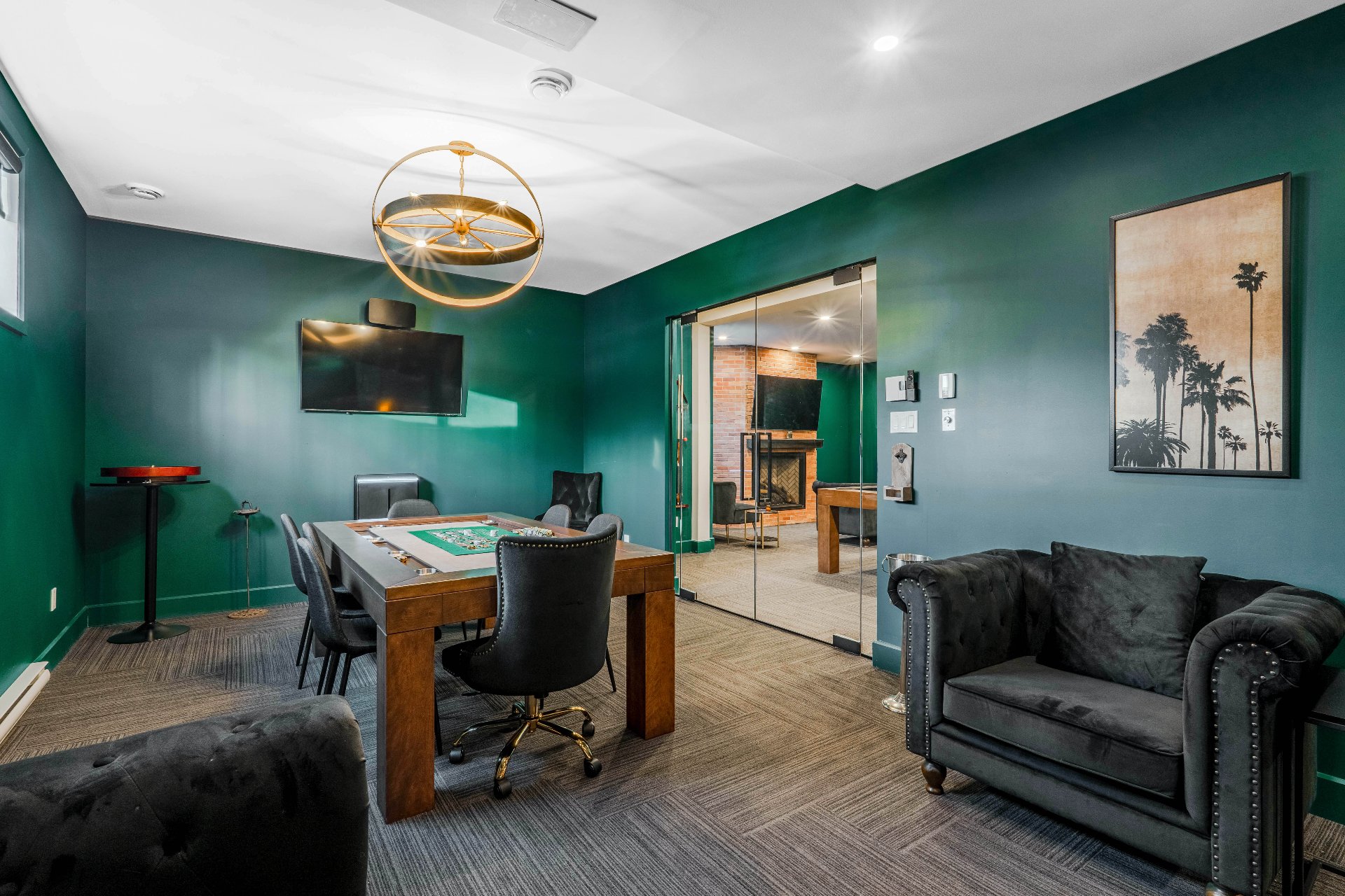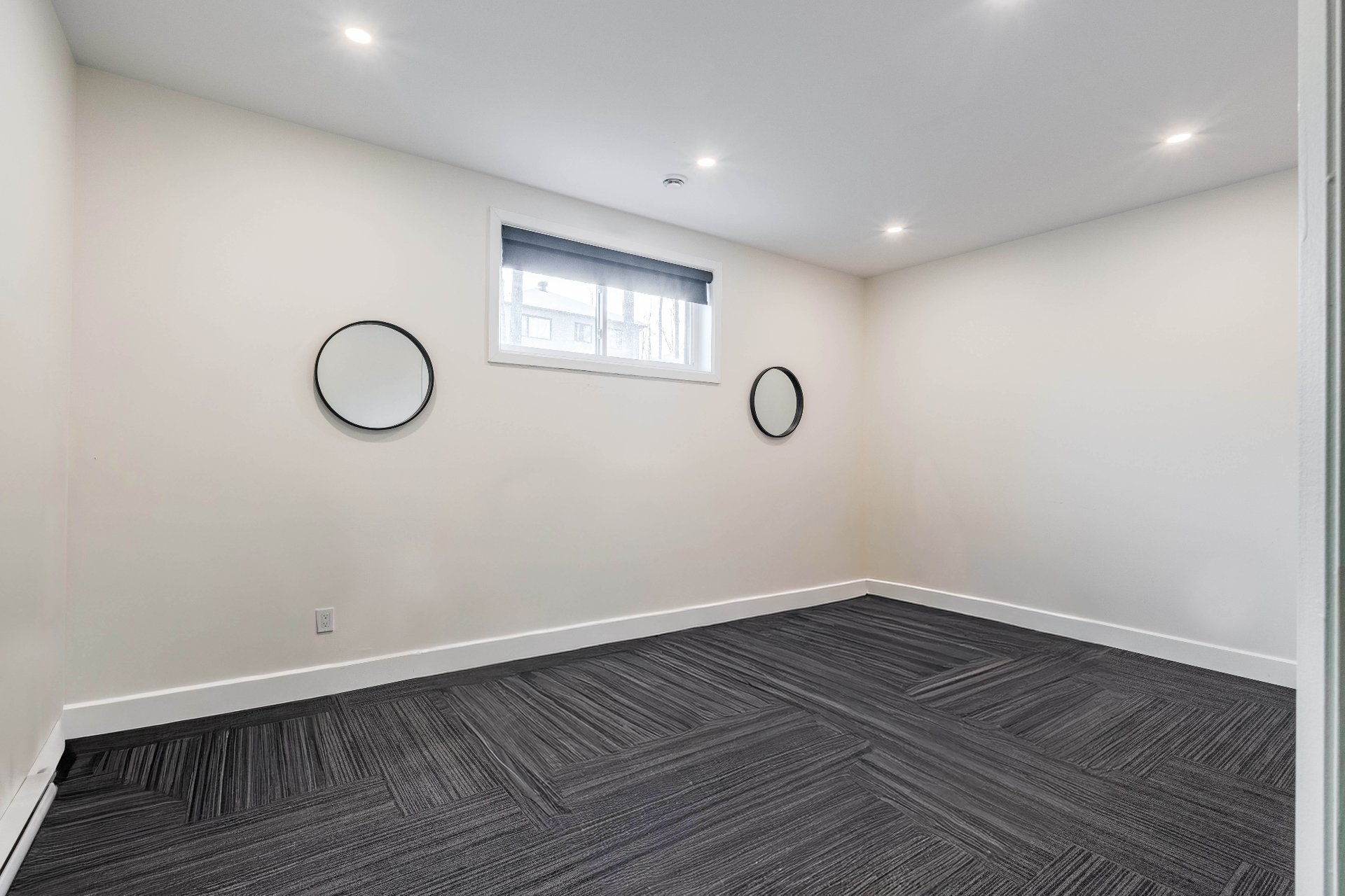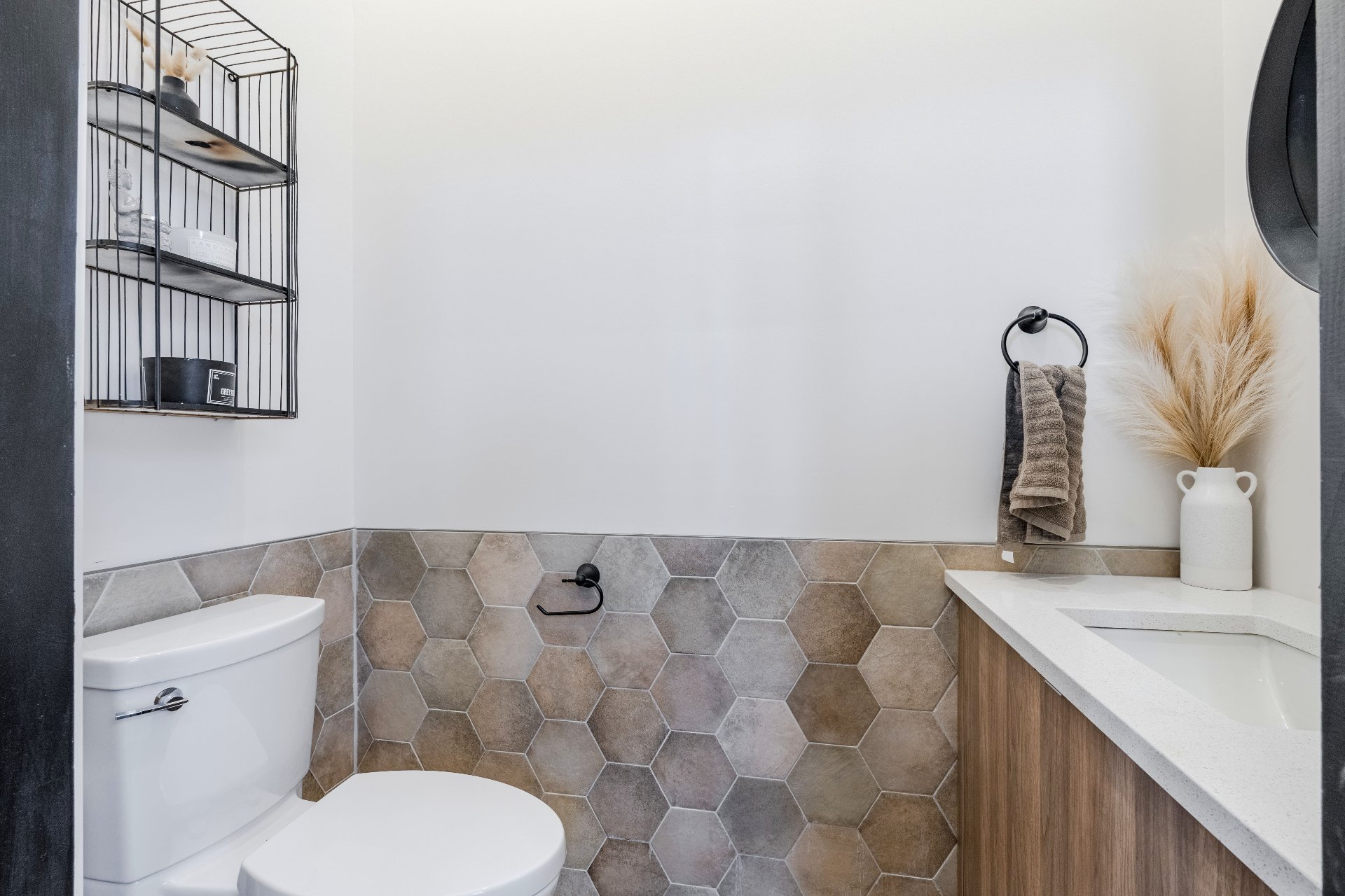 Le sous-sol entièrement aménagé offre une ambiance lounge remarquable avec coin bar, foyer au gaz et espace détente. Une chambre a été aménagée en salle de jeux avec mobilier intégré, offrant une grande polyvalence. La salle de bains du sous-sol, au style luxueux, impressionne par ses finis d'aspect marbre foncé et sa douche indépendante. Une chambre avec walk-in permet d'y accueillir famille ou invités dans un confort absolu.