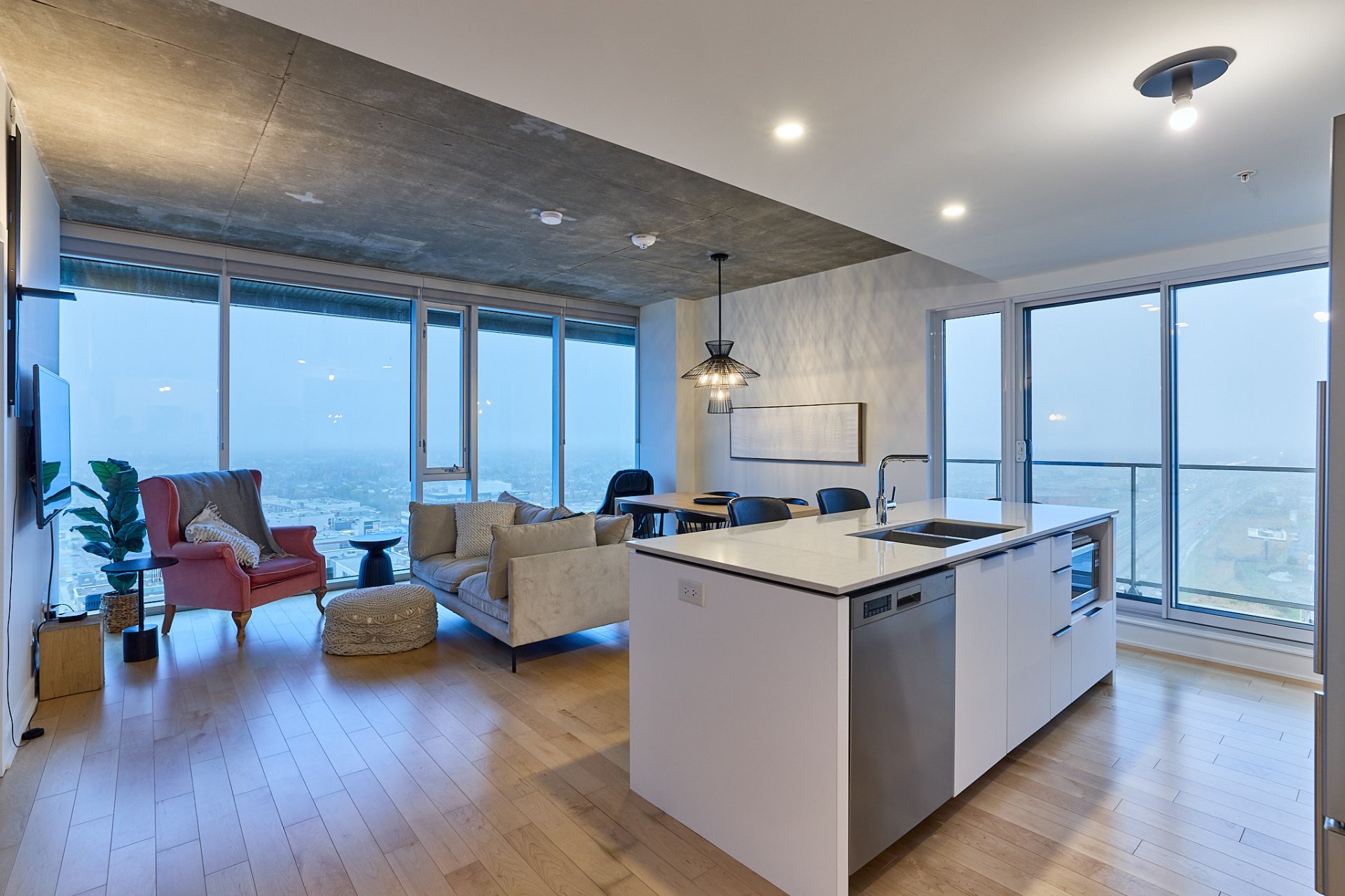 Situé au 21e étage, ce magnifique condo de coin entièrement meublé et équipé offre une vue spectaculaire sur Montréal, sans aucun vis-à-vis. Les fenêtres du plancher au plafond inondent l'unité de lumière naturelle tout au long de la journée jusqu'au coucher du soleil, créant une ambiance à la fois moderne et apaisante.