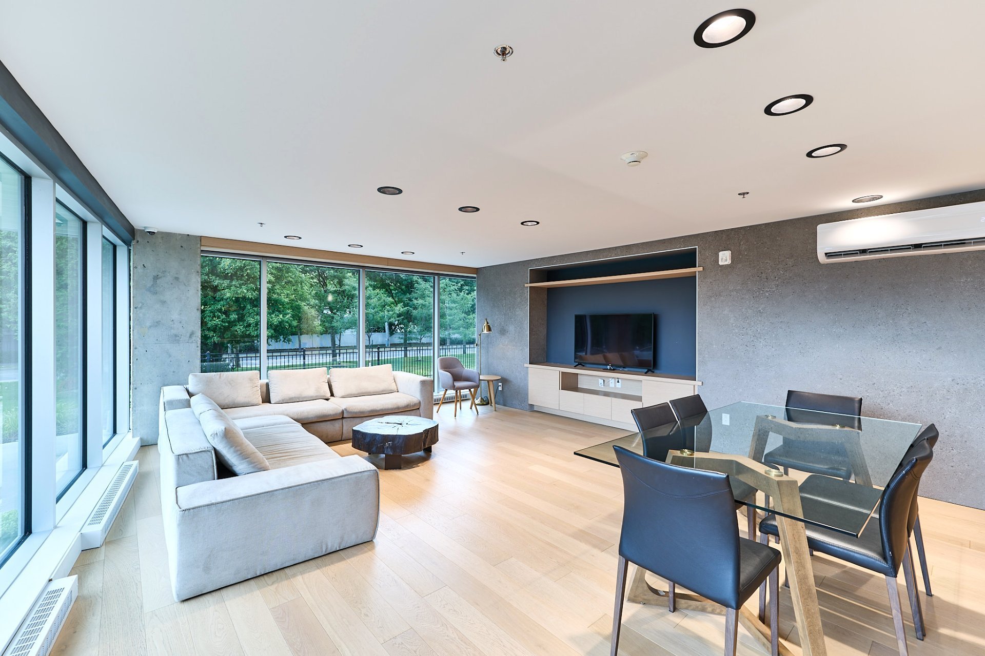 Cuisinière, réfrigérateur, lave-vaisselle, luminaires, pôles et rideaux, stores, thermopompes murales (2x), manette de la porte de garage.